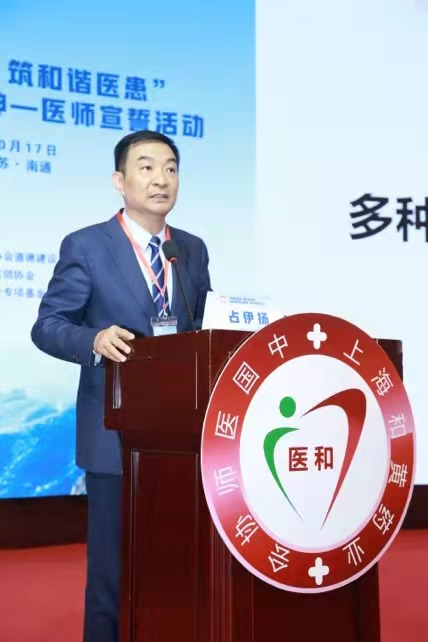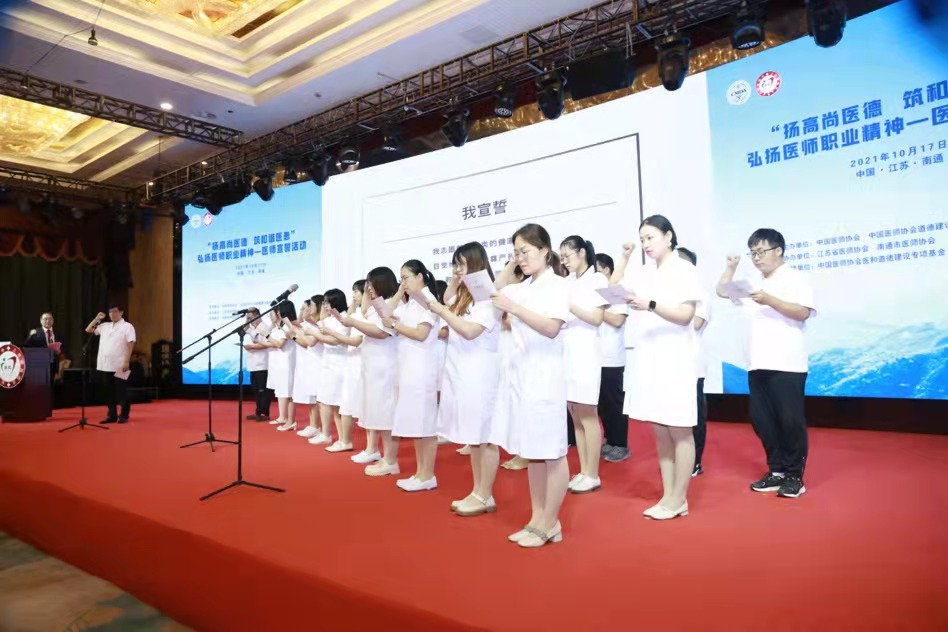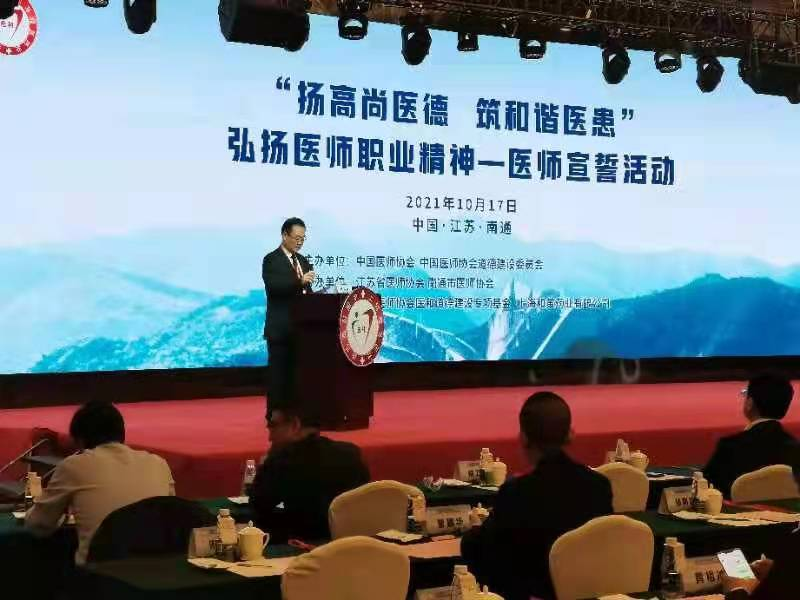 10月17日,由中国医师协会道德建设委员会主办,江苏省医师协会、南通市医师协会协办的“扬高尚医德,筑和谐医患”弘扬医师职业精神——中国医师宣誓活动在南通市成功举行。中国医师协会副秘书长石丽英、外联部主任沈根新、江苏省医师协会副会长兼秘书长刘彦群、副秘书长王跃、江苏省人民医院副院长占伊扬、南通市卫生健康委员会主任陈冬梅、市医师协会副会长、各县(市)区卫健委分管领导和各级医院书记、院长、分管院长及医师代表300多人出席了会议。