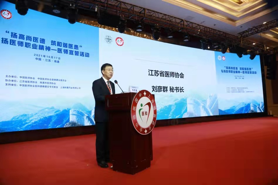 江苏省医师协会副会长兼秘书长刘彦群在致辞中指出,省医师协会成立以来,紧紧围绕加强医师队伍建设,在提高技能的同时,加强中国医师宣言、中国医师道德准则的学习,医师职业精神和素养不断得到升华,涌现出一大批勇攀技术高峰、医德高尚的医师,特别是在抗击新冠疫情中他们主动请缨,临危受命,为疫情防控作出了巨大贡献。今年是纪念辛亥革命110周年,中国共产党成立100周年,在这个重要时刻我们在这里隆重聚会,重温中国医师宣言,相信能激励广大医师进一步树立自尊、自爱、自强的行业形象;进一步关心、关爱生命、守护健康、构建和谐的医患关系;进一步推动医院文化建设,促进医疗卫生事业的改革发展。