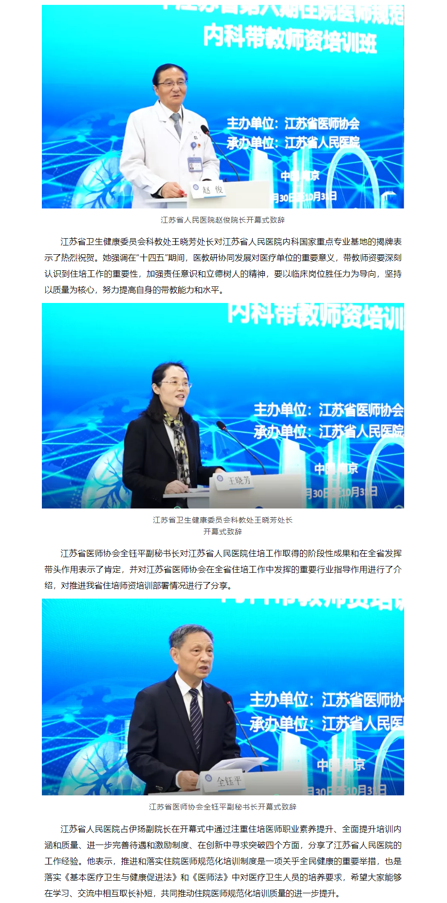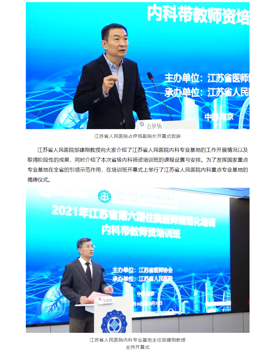 江苏省卫生健康委员会科教处王晓芳处长,江苏省医师协会全钰平副秘书长,江苏省人民医院赵俊院长、占伊扬副院长、教育处朱滨海处长和内科专业基地主任邹建刚教授出席培训班开幕式。赵俊院长、王晓芳处长、全钰平副秘书长、占伊扬副院长分别作了开幕演讲,开幕式由邹建刚教授主持。