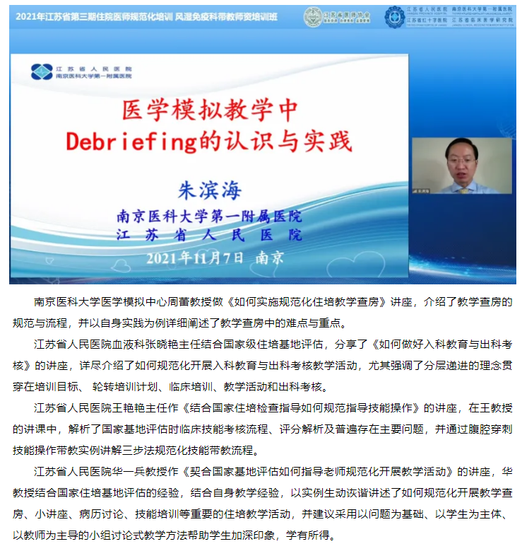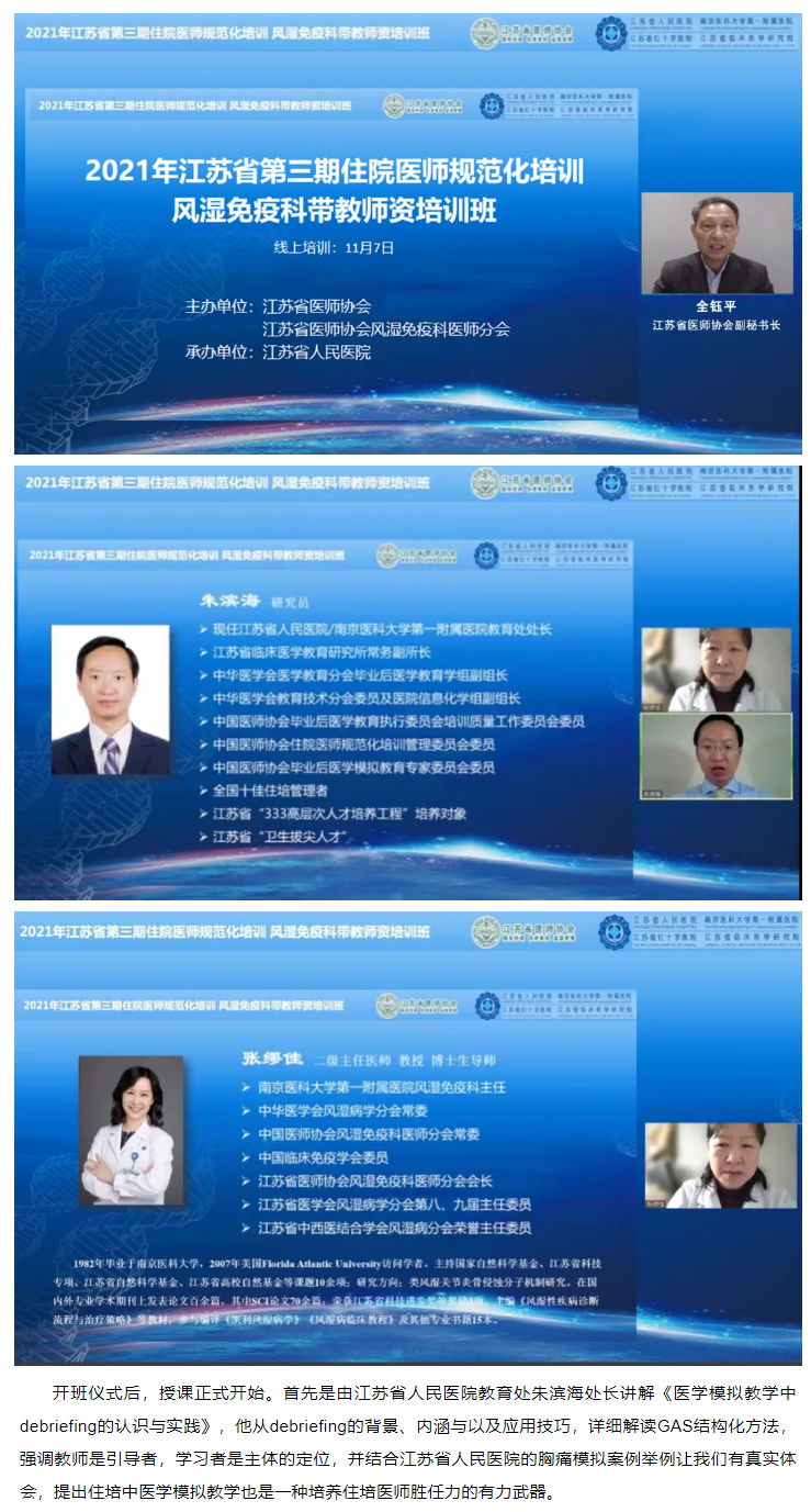 11月7日,由江苏省医师协会、江苏省医师协会风湿免疫科医师分会主办,江苏省人民医院承办的“2021年江苏省第三期住院医师规范化培训风湿免疫科带教师资培训班”在线上举办。来自全省各住培基地及协同单位的134名风湿免疫科专业带教老师参加了培训。