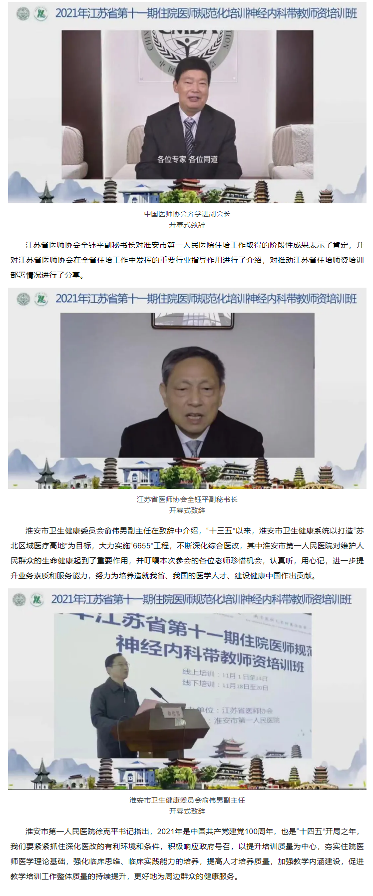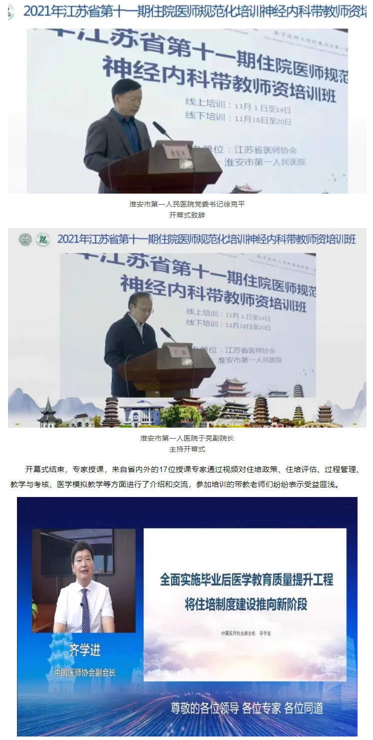 中国医师协会齐学进副会长、江苏省医师协会全钰平副秘书长、淮安市卫生健康委员会俞伟男副主任、淮安市第一人民医院徐克平书记参加了培训班开幕式并致辞,此外淮安市第一人民医院培训处王丙剑处长和神经内科专业基地主任田向阳教授等出席开幕式,淮安市第一人民医院于亮副院长主持开幕式。