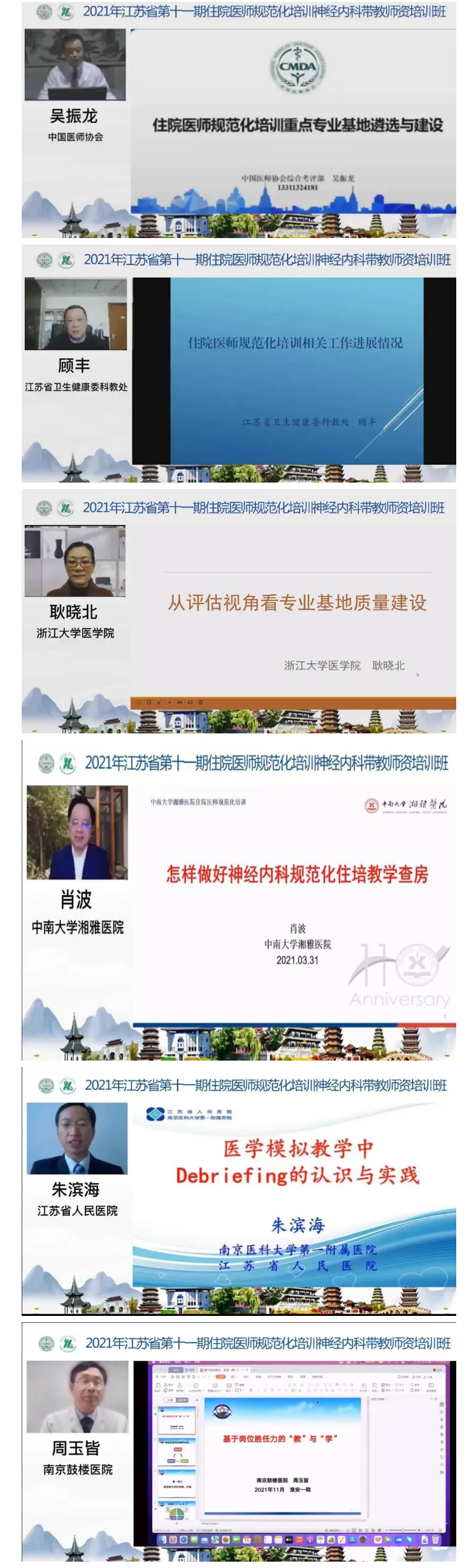 此外,本次培训班还邀请了美国乔治华盛顿大学医院陈海作《美国神经内科住院医师培训》、浙江大学医学院附属第一医院罗本艳作《教学引导在神经内科带教的运用》的讲座、南京鼓楼医院徐运作《神经内科住培与科室人才培养》的讲座、苏北人民医院李晓波作《神经内科师资教学能力建设》的讲座、江苏省人民医院王艳艳作《如何规范指导临床技能操作》的讲座、江苏省人民医院卢妙作《情境模拟教案撰写训练营》的讲座、淮安市第一人民医院田向阳作《地市级医院神经内科住培工作模式及经验分享》的讲座、淮安市第一人民医院郑金龙作《培养让病人放心的神经科医生》的讲座、淮安市第一人医院安坤作《神经内科住培基地分层分级培训实践》的讲座。