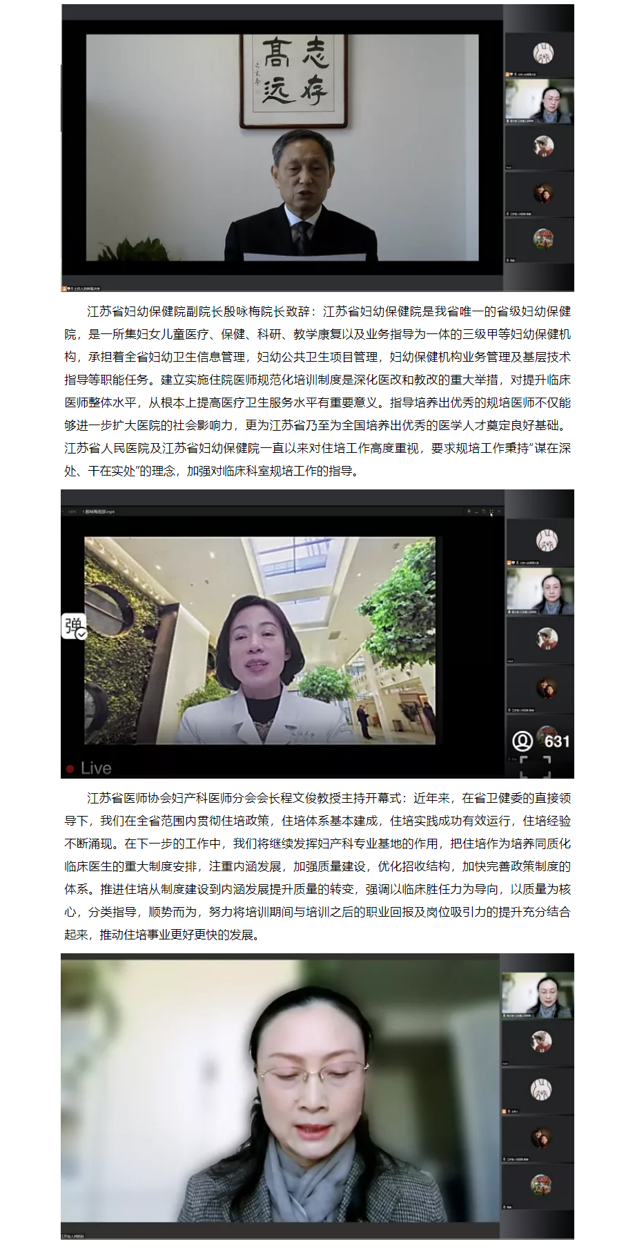 开幕式上,江苏省医师协会副秘书长全钰平教授致辞:首先热烈祝贺第二期江苏省妇产科住培师资培训班线上顺利开班,对参会的学员表示热烈欢迎。住院医师培训是加强卫生人才队伍建设、提高卫生质量、深化卫生改革的重要方面,也是医院高质量发展的需求。我省全面贯彻和落实国家对于住培工作的政策和要求,为住培工作的进展起到了积极效果。江苏省妇幼保健院对于住培工作充分认识,克服困难,让会议在线上召开,让我们共同推进妇产科住培工作扎实有效开展。