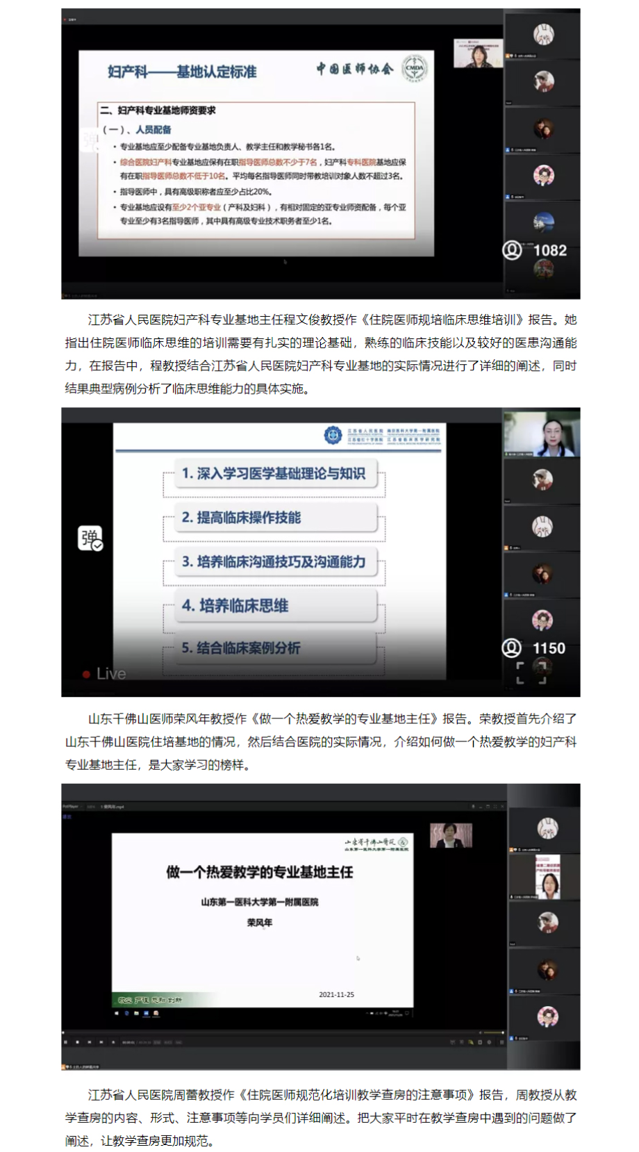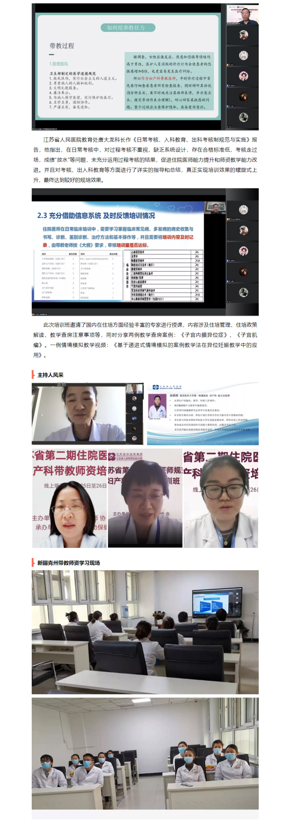 为加强我省妇产科住院医师规范化培训师资队伍建设,提高我省妇产科住培师资质量,2021年11月25日至26日由江苏省医师协会,江苏省医师协会妇产科医师分会主办,江苏省妇幼保健院承办的“2021年江苏省第二期住院医师规范化培训妇产科带教师资培训班”在线上顺利举办,妇产科专业的住培老师共156人参加培训,其中与江苏省人民医院对口支援的克州人民医院也有9名学员参加了此次培训。