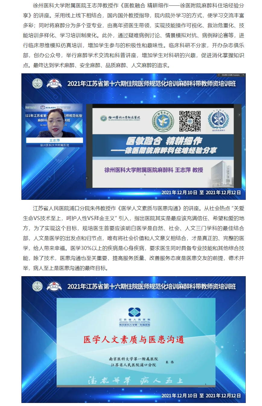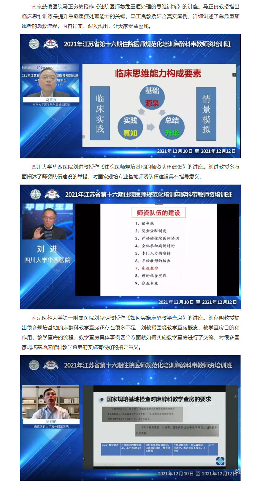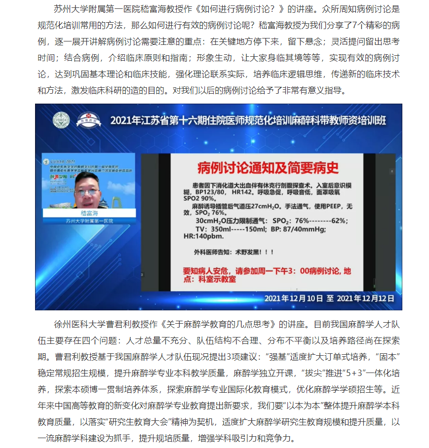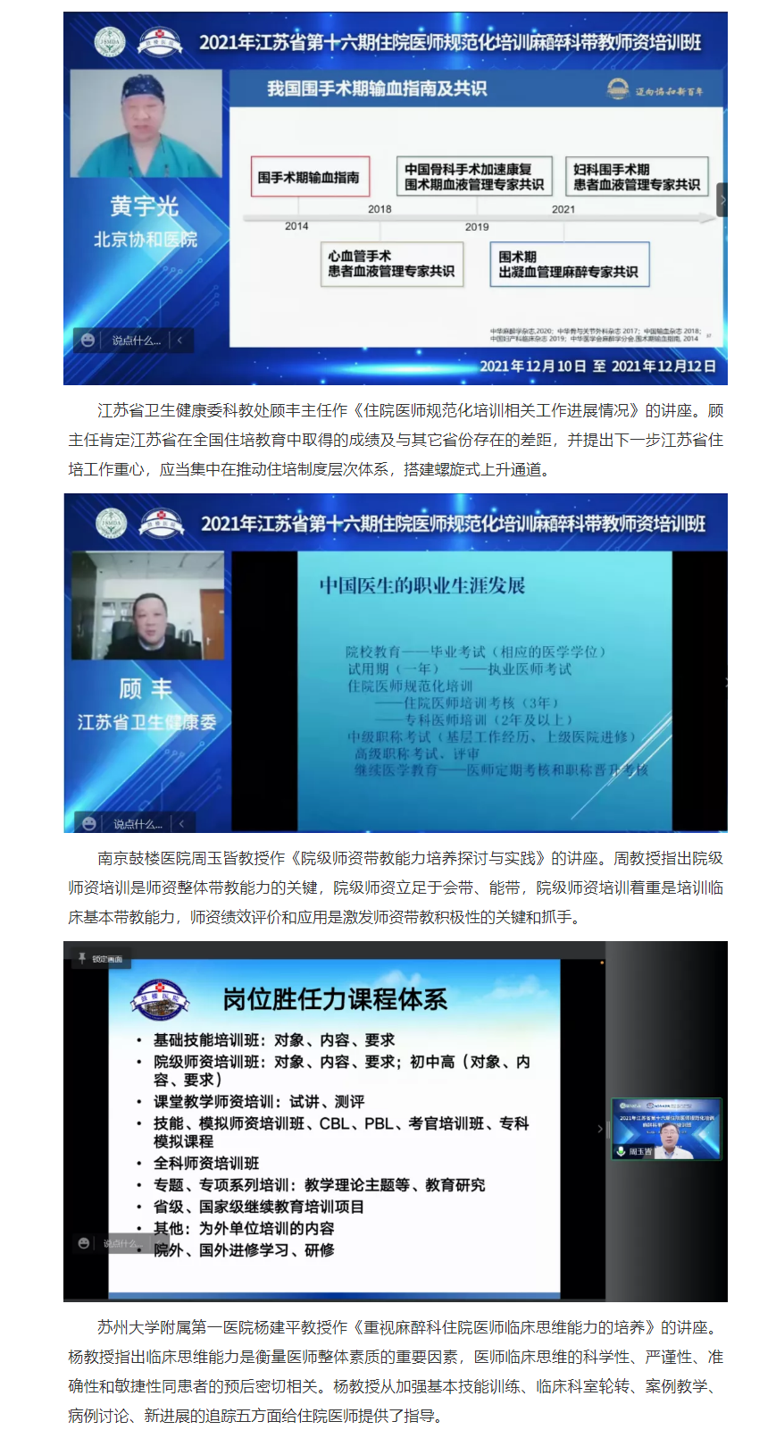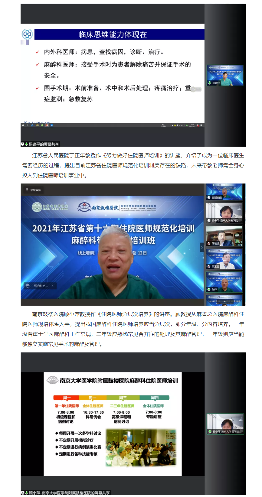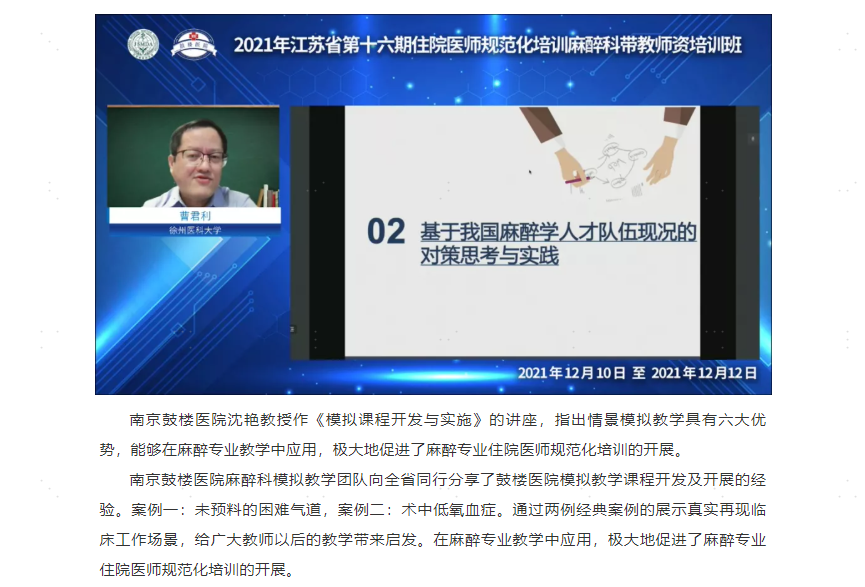 为加强我省麻醉科住院医师规范化培训师资队伍建设,提高我省麻醉科住培师资质量,2021年12月10日至12日由江苏省医师协会主办,南京鼓楼医院承办的“2021年江苏省第十六期住院医师规范化培训麻醉科带教师资培训班”在线上顺利举办,来自全省麻醉科专业的住培老师共92人参加培训。