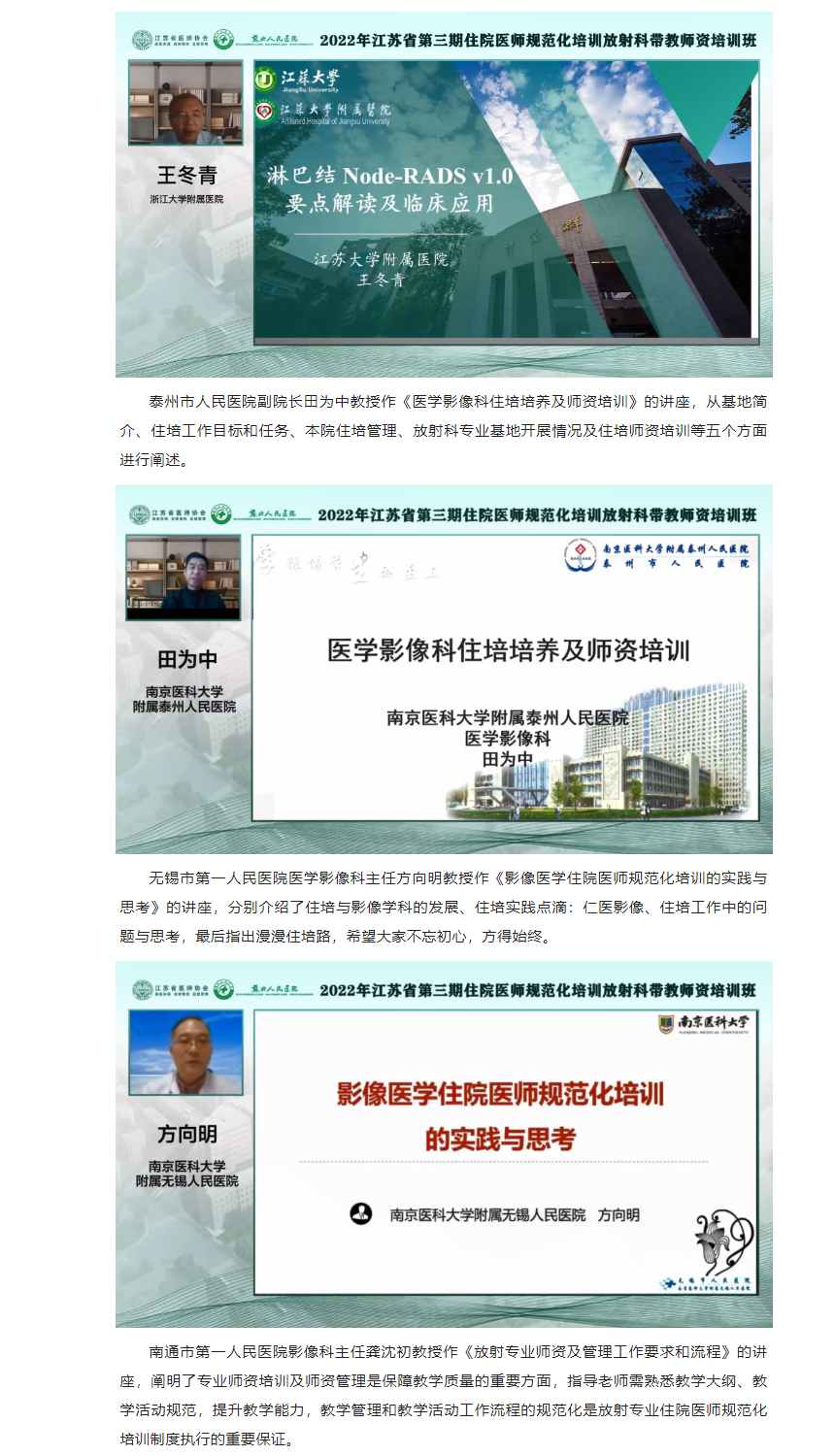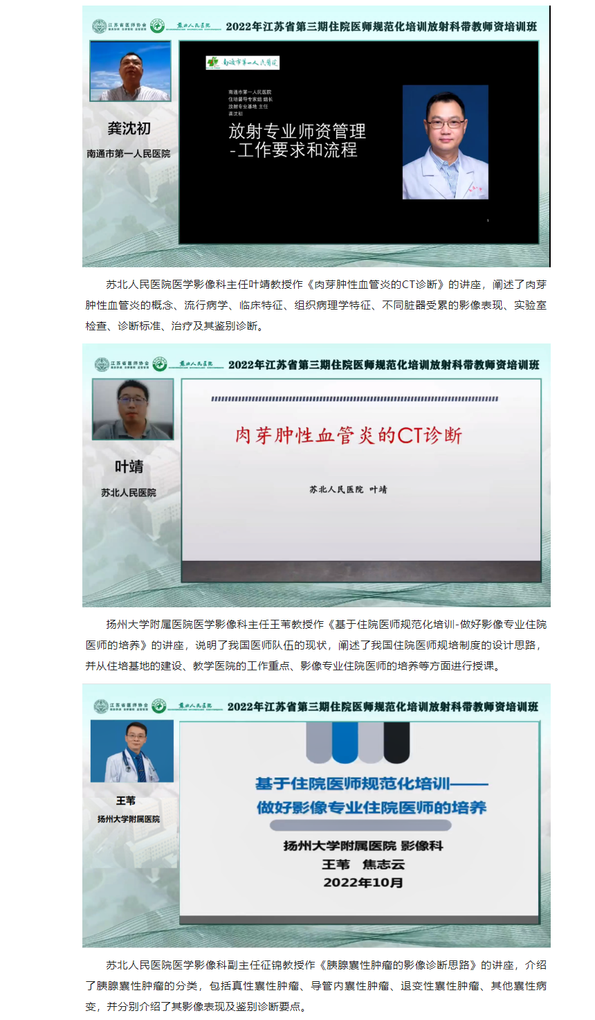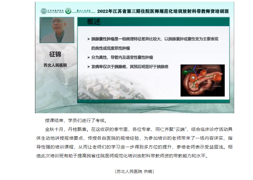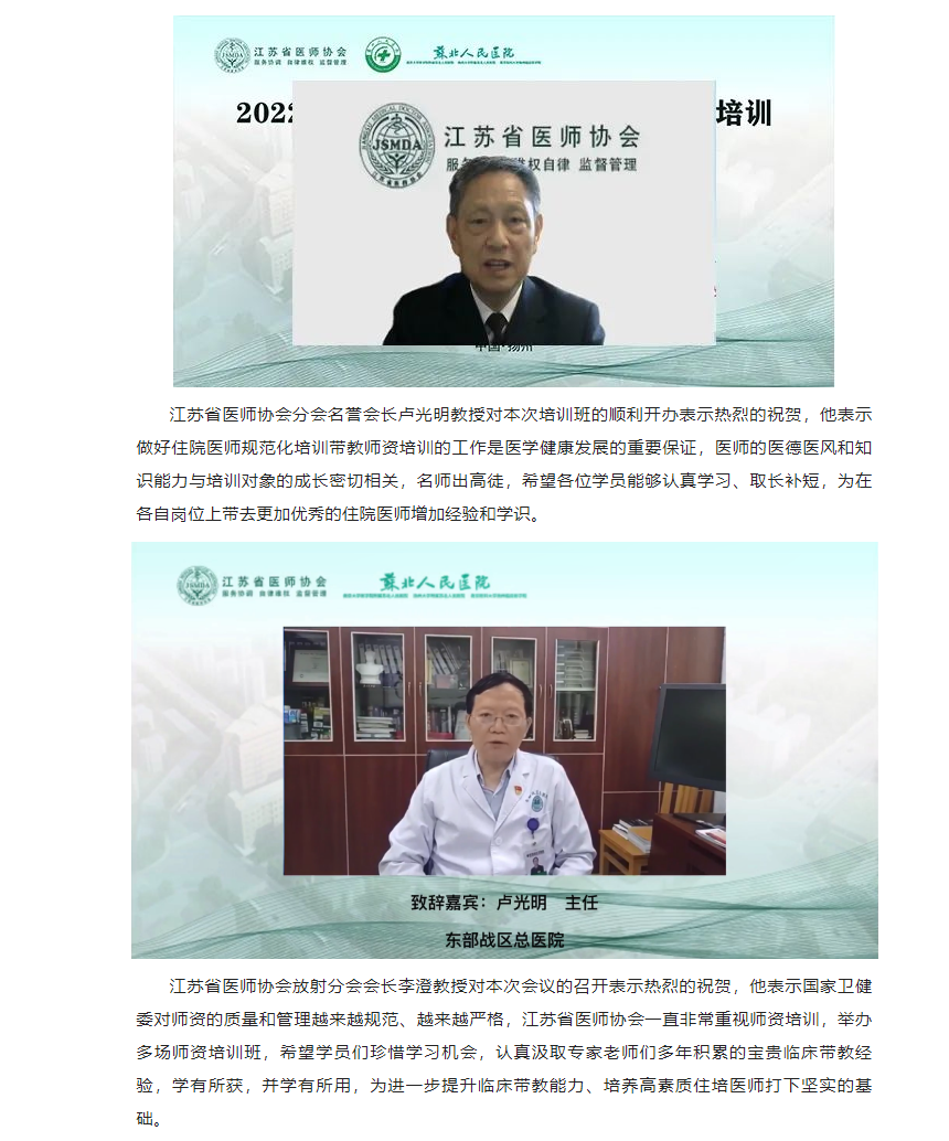为加强我省住院医师规范化培训师资队伍建设,提高我省住培师资质量,受江苏省卫生健康委科教处委托,由江苏省医师协会主办,苏北人民医院承办的“2022年江苏省第三期住院医师规范化培训放射科带教师资培训班”顺利举办。本次培训班采用线上培训学习的方式开展。来自省内46个国家级住培基地放射科医学专业的住培老师共135人免费参加培训。