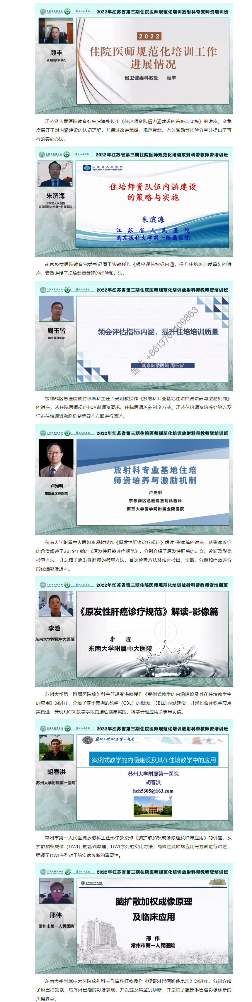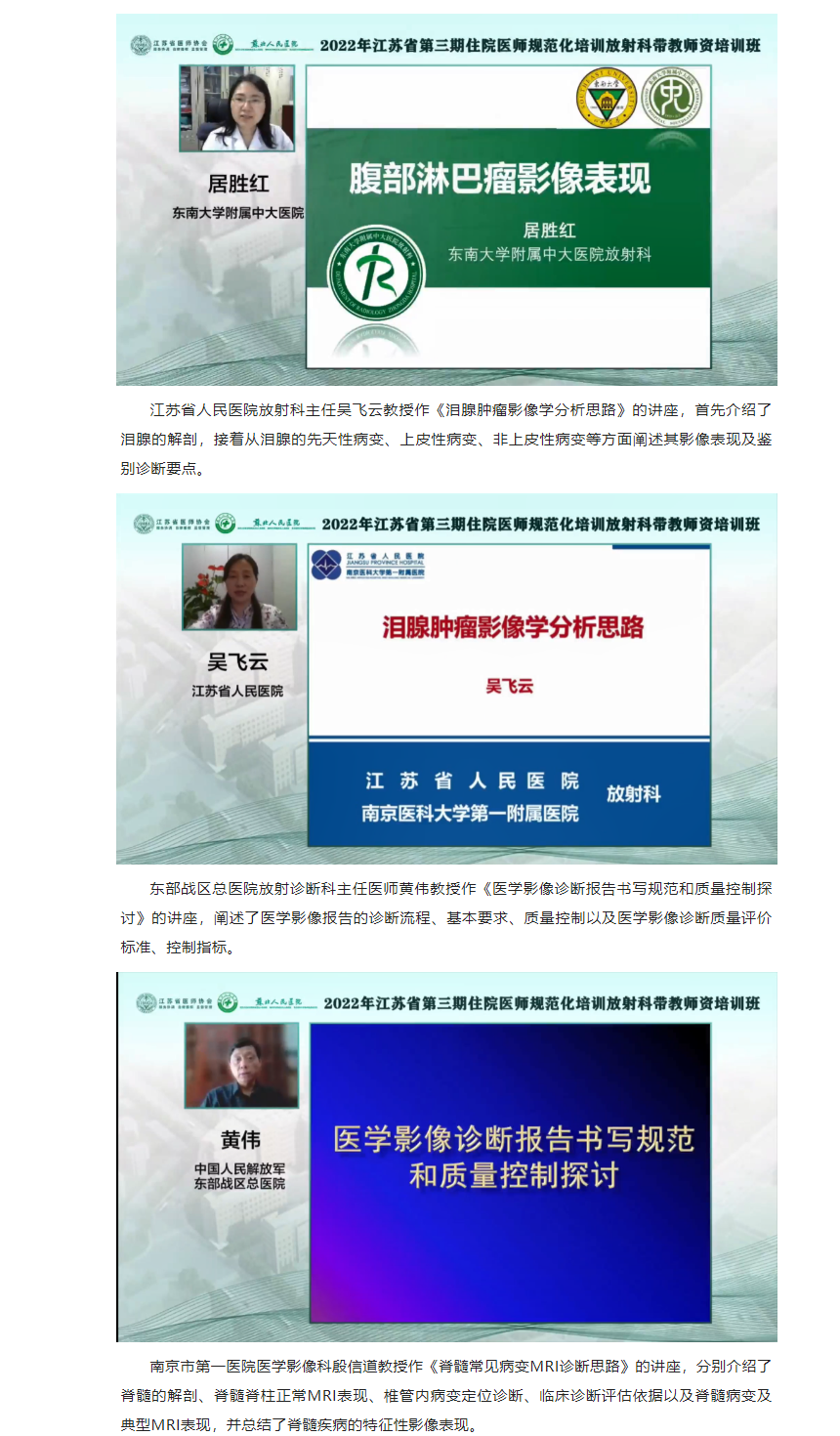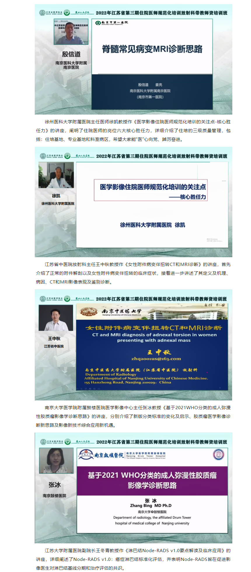 为加强我省住院医师规范化培训师资队伍建设,提高我省住培师资质量,受江苏省卫生健康委科教处委托,由江苏省医师协会主办,苏北人民医院承办的“2022年江苏省第三期住院医师规范化培训放射科带教师资培训班”顺利举办。本次培训班采用线上培训学习的方式开展。来自省内46个国家级住培基地放射科医学专业的住培老师共135人免费参加培训。