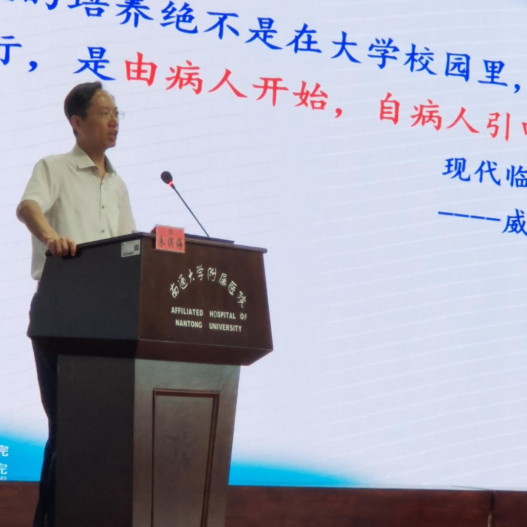 江苏省人民医院教育处处长朱滨海作《有效执行住培两个新版标准的改进策略》讲座,给学员们介绍了住院医师规范化培训内容与标准(2022年版),从目标明晰、核心胜任力、分层递进和临床实践这四方面详细解读了内容和标准。