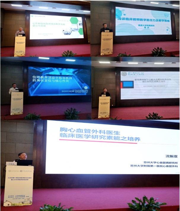 接下来的培训环节,来自省内外13名住培教学专家进行了精彩的授课,授课内容涵盖了胸心外科住培政策解读、住培细则研习、住培工作模式介绍、带教经验分享、人文医学教育等多个方面。江苏省人民医院朱滨海教授讲授《住培基地评估的认识与实践》、南通大学附属医院尤庆生教授讲授《青年医生的培养与职业规划》、苏州大学附属第二医院徐卫华教授讲授《胸心外科临床技能操作的床旁教学》、苏州大学附属第一医院周金懿教授讲授《模拟教学在毕业后医学教育的实践运用》、南京市第一医院陈鑫教授讲授《外科(胸心外科方向)专业住培标准解读》、南京鼓楼医院周玉皆教授讲授《分层递进培训方案的设计思路与实践》、苏州大学附属第一医院祁加俊教授讲授《院级督导的组织与实施》、复旦大学附属中山医院余情教授讲授《分层递进过程考核的设计与实施》、苏州大学附属第一医院沈振亚教授讲授《胸心血管外科医生临床医学研究素能之培养》、东南大学附属中大医院刘志勇教授讲授《心外科住院医师培训教学活动设计与实施》、南通大学附属医院周庆教授讲授《浅谈临床教学胜任力及教学策略》、苏州大学附属第一医院赵军教授讲授《住培教学活动中指导医师的角色定位与核心作用》、苏州大学第一附属医院余云生教授讲授《新培养体制下心脏大血管外科专硕培养之浅见》。