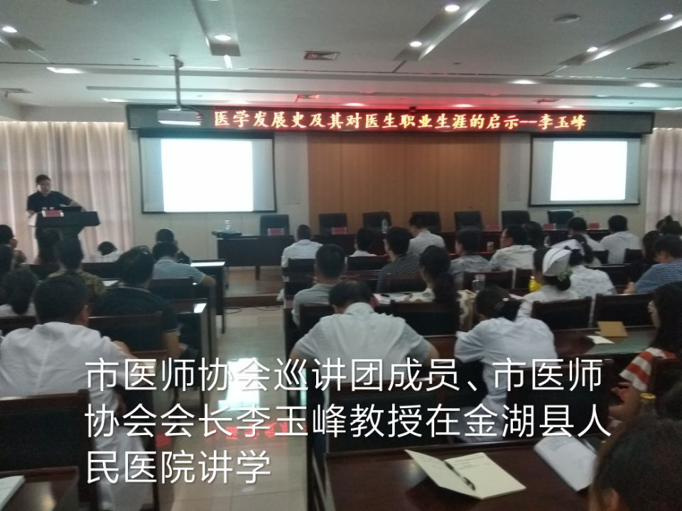 为庆祝第二个中国医师节,淮安市医师协会成立了医学科学和医学人文巡讲团,在全市各县区及市直医院进行巡讲。巡讲团就人文医学的应用,从医学发展史对医生职业生涯的启示、临床与科研的关系及个人的成长历程等方面做了专业、系统地分析和阐述,旨在全市医务人员中进一步提倡人文医学服务理念,弘扬人文关怀精神,提高人文医学技能,更好地为患者服务。8月6日,巡讲团在金湖县人民医院进行了首站巡讲,受到与会人员的欢迎。