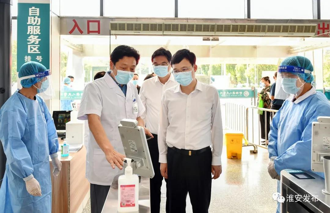 在盱眙县人民医院,陈之常现场察看预检分诊情况,听取疫情防控工作、院感防控情况汇报。