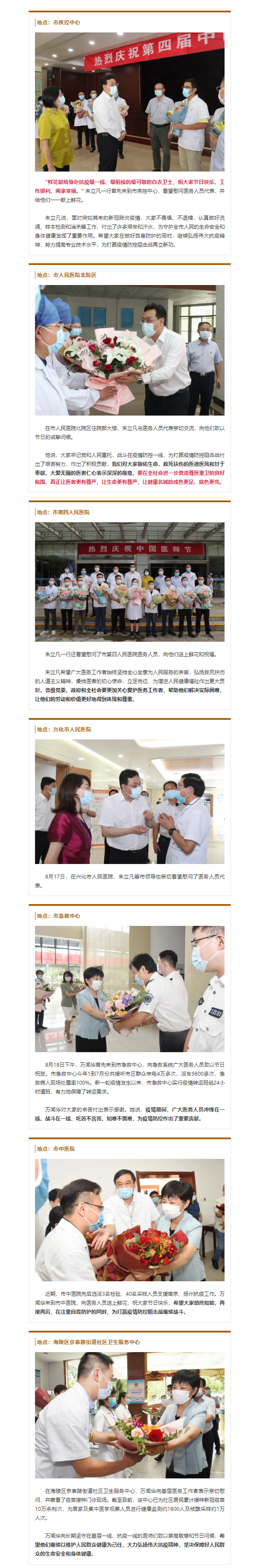 8月19日是第四个中国医师节。今天下午,市委书记朱立凡,市委副书记、代市长万闻华分别带队,来到市区部分医疗机构,看望慰问医务工作者代表,并通过他们向全市广大医务工作者致以节日的问候和崇高的敬意。