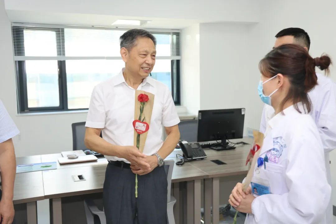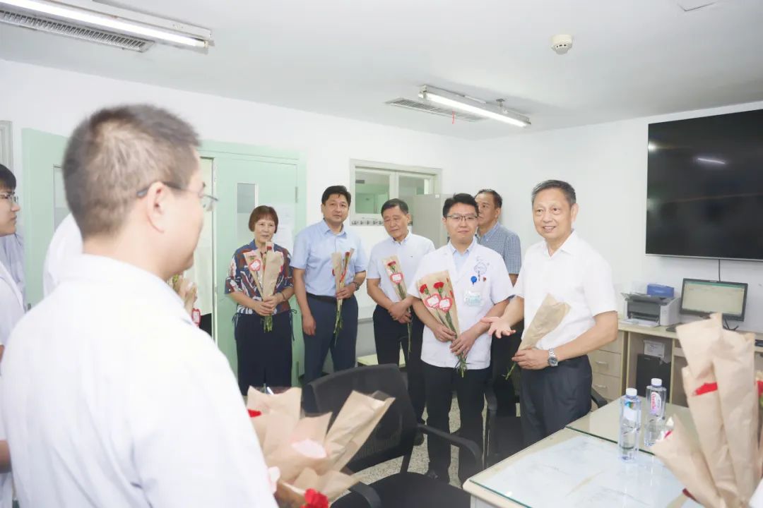 全钰平一行分别走访慰问了我院神经内科、ICU、肝胆胰外科等科室的一线医务人员,为广大奋战在一线的医生们送上鲜花,并祝他们医师节快乐,感谢他们的无私奉献和辛苦付出。每到一处,全钰平代表省医师协会,向一线医务工作者致以诚挚问候和美好祝愿,并与一线医务人员亲切交谈,仔细询问他们的工作、生活情况,表达了省医师协会对我院广大医师的关爱。