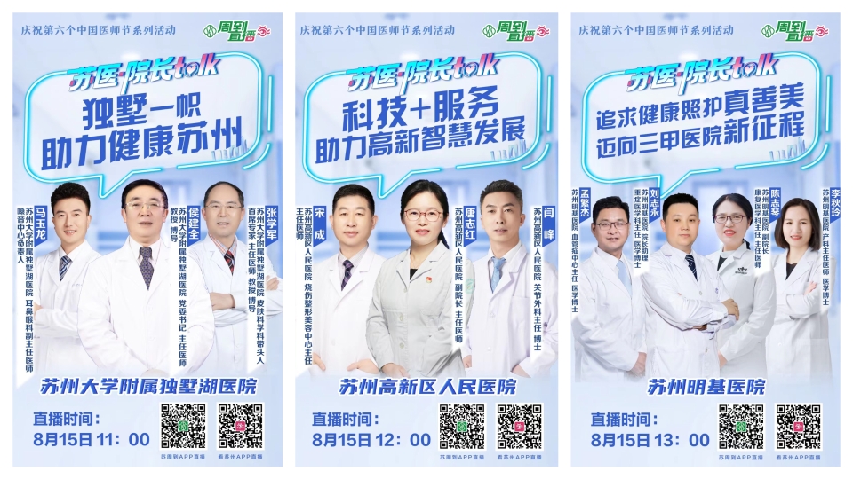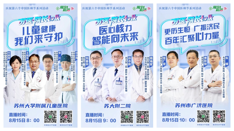 就在今天上午,医师节系列活动之《苏医·院长Talk》在看苏州、苏周到APP直播,来自苏州大学附属儿童医院、苏州大学附属第二医院、苏州大学附属独墅湖医院、苏州市广济医院、苏州高新区人民医院、苏州市明基医院的六组专家团队做客靴子楼演播室,结合心胸外科、神经内科、骨科、泌尿科、心理科、皮肤科、耳鼻喉科、妇产科、关节外科、烧伤整形美容科等多个“金牌科室”,分别为观众带来6场详细生动的《苏医·院长talk》节目,总时长长达6个小时!