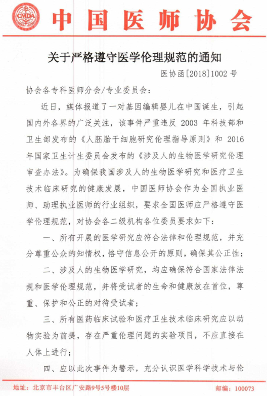 近日,媒体报道了一对基因编辑婴儿在中国诞生,引起国内外各界的广泛关注,该事件严重违反2003年科技部和卫生部发布的《人胚胎干细胞研究伦理指导原则》和2016年国家卫生计生委发布的《涉及人的生物医学研究伦理审查办法》。为确保我国涉及人的生物医学研究和医疗卫生技术临床研究的健康发展,中国医师协会作为全国执业医师、助理执业医师的行业组织,要求全国医师应严格遵守医学伦理规范,对协会各二级机构各位委员要求如下: