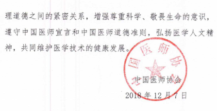 四、应以此次事件为警示,充分认识医学科学技术与伦理道德之间的紧密关系,增强尊重科学、敬畏生命的意识,遵守中国医师宣言和中国医师道德准则,弘扬医学人文精神,共同维护医学技术的健康发展。