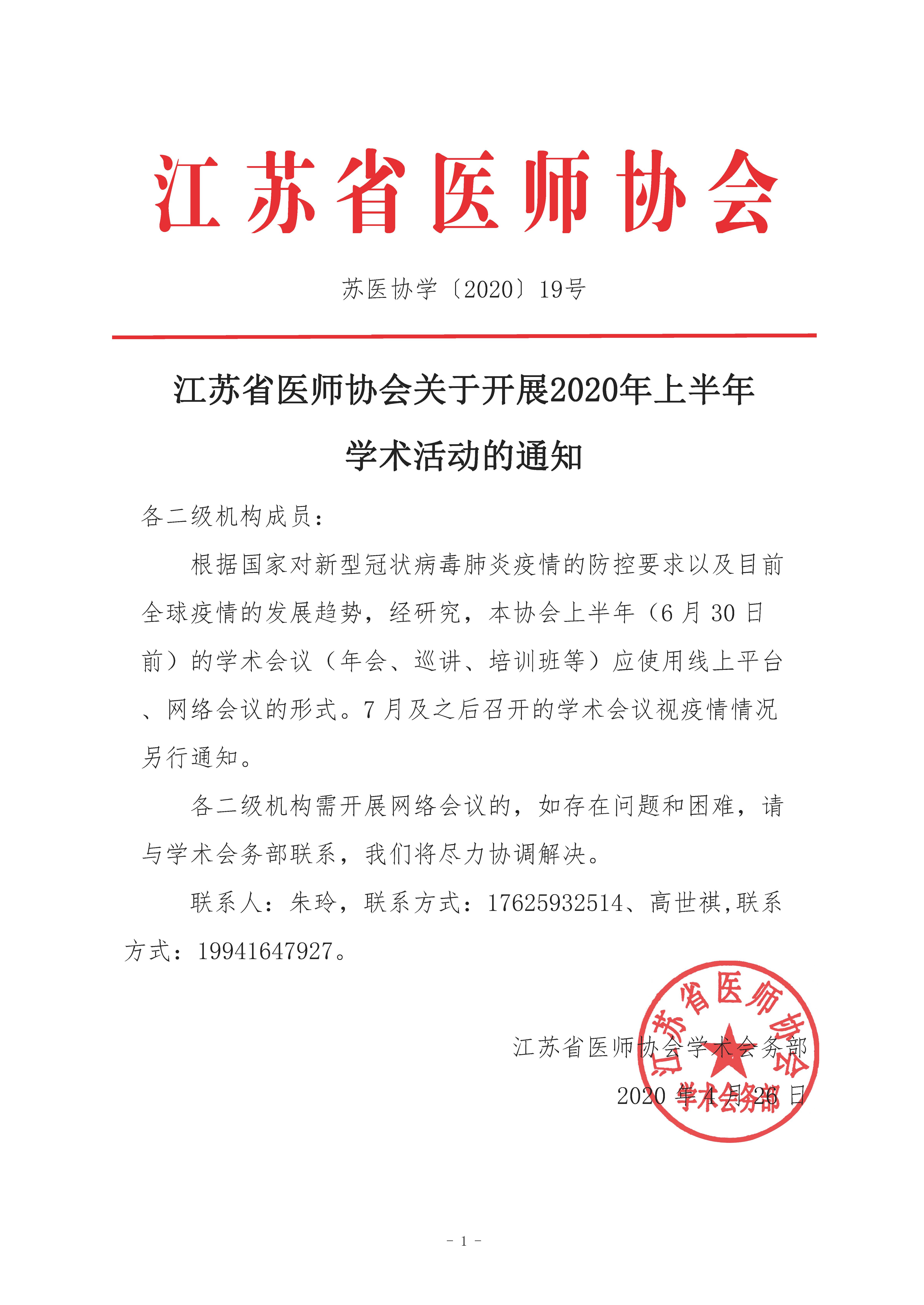 江苏省医师协会关于开展2020年上半年学术活动的通知