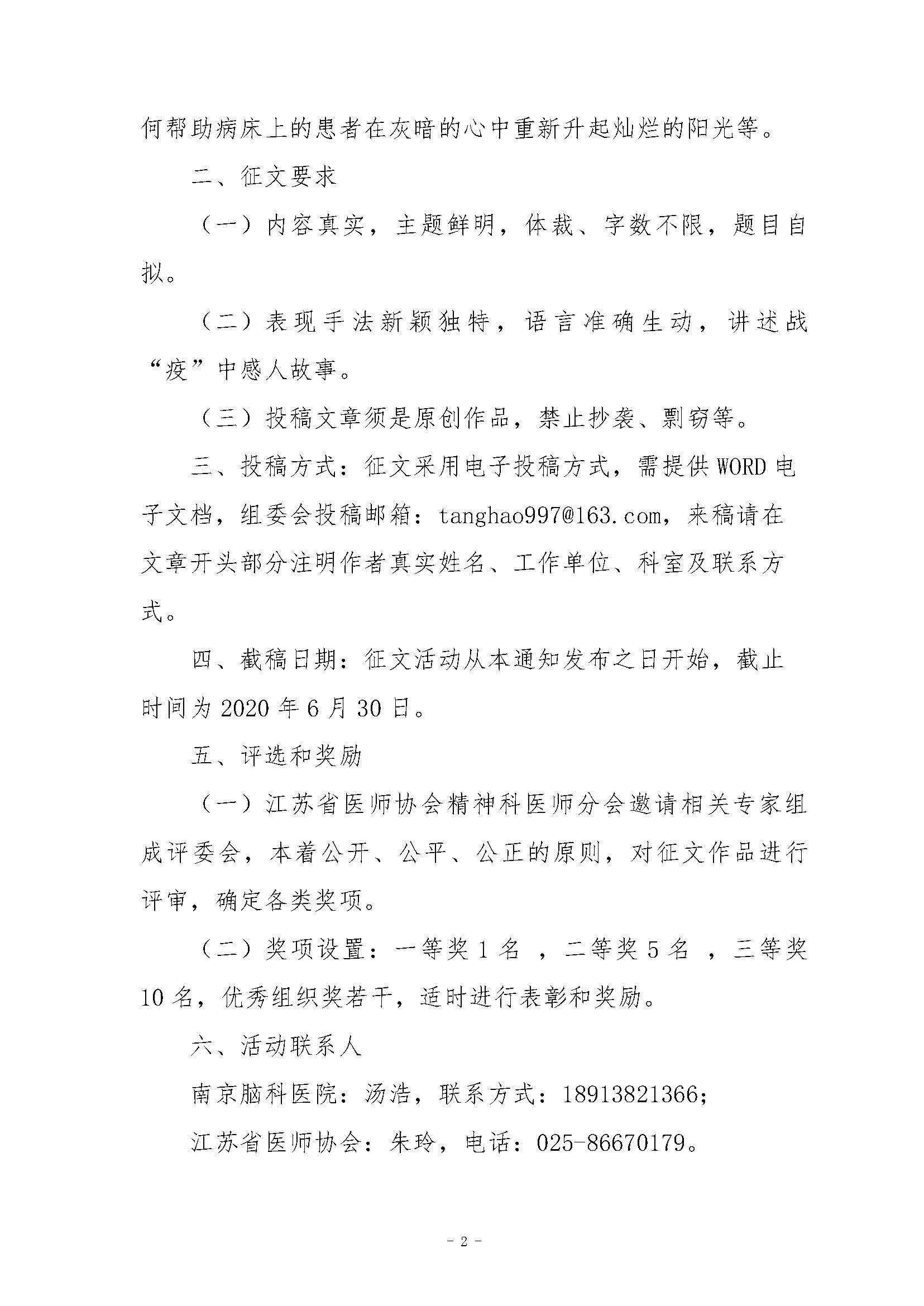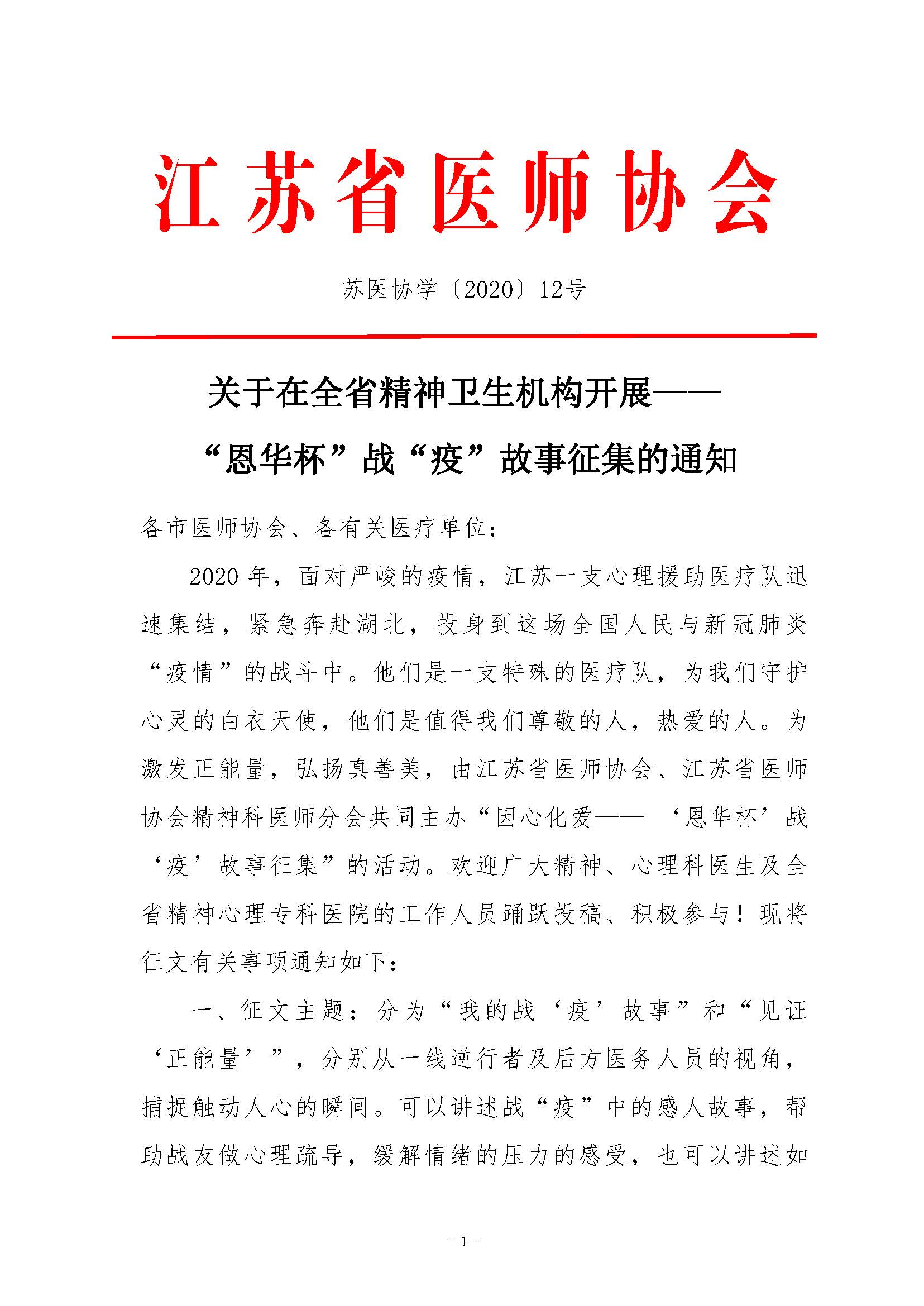 2020江苏省医师协会关于在全省精神卫生机构开展“因心化爱—— ‘恩华杯’战‘疫’故事征集活动”通知