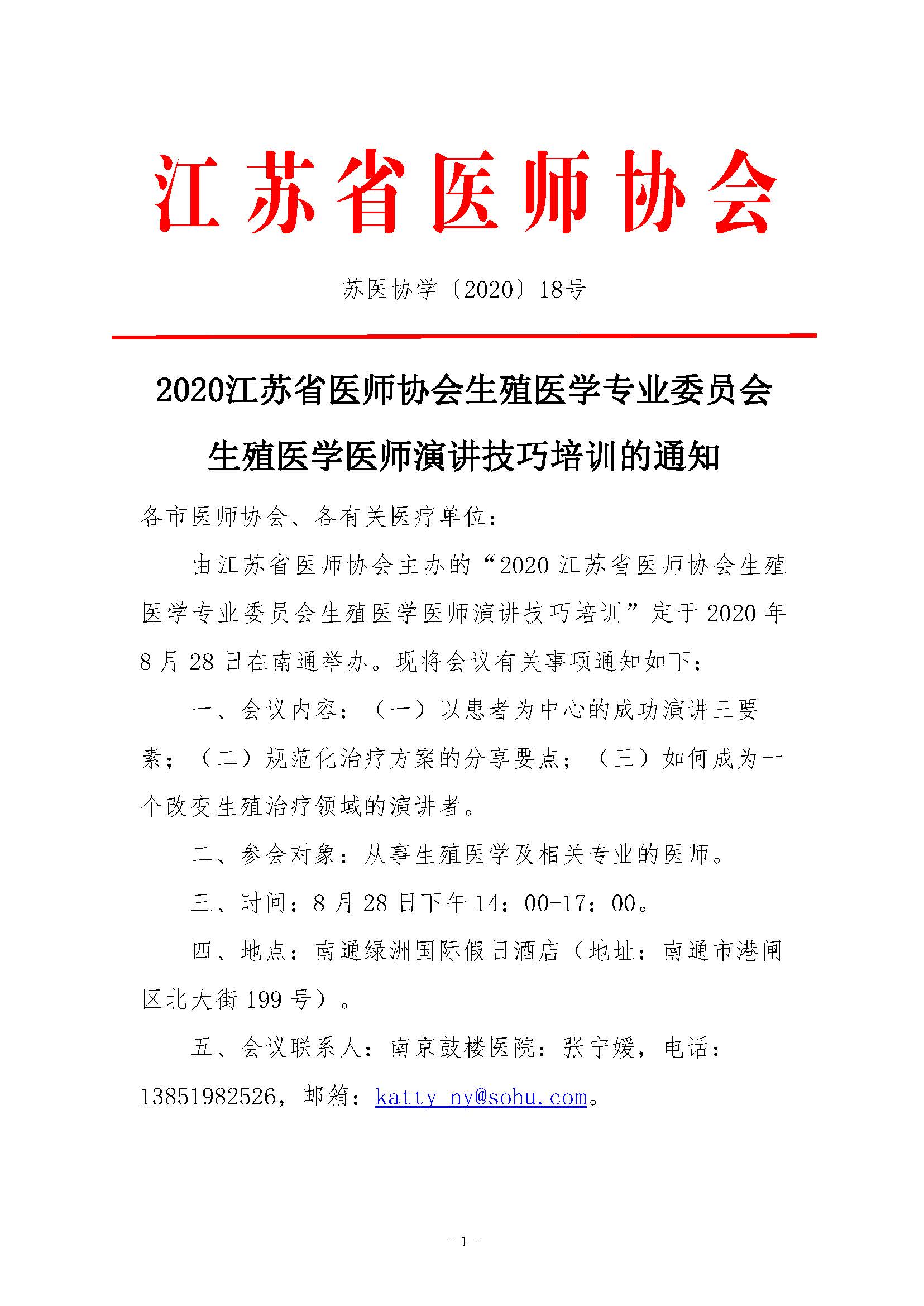 2020江苏省医师协会生殖医 学专业委员会生殖医学医师演讲技巧培训通知