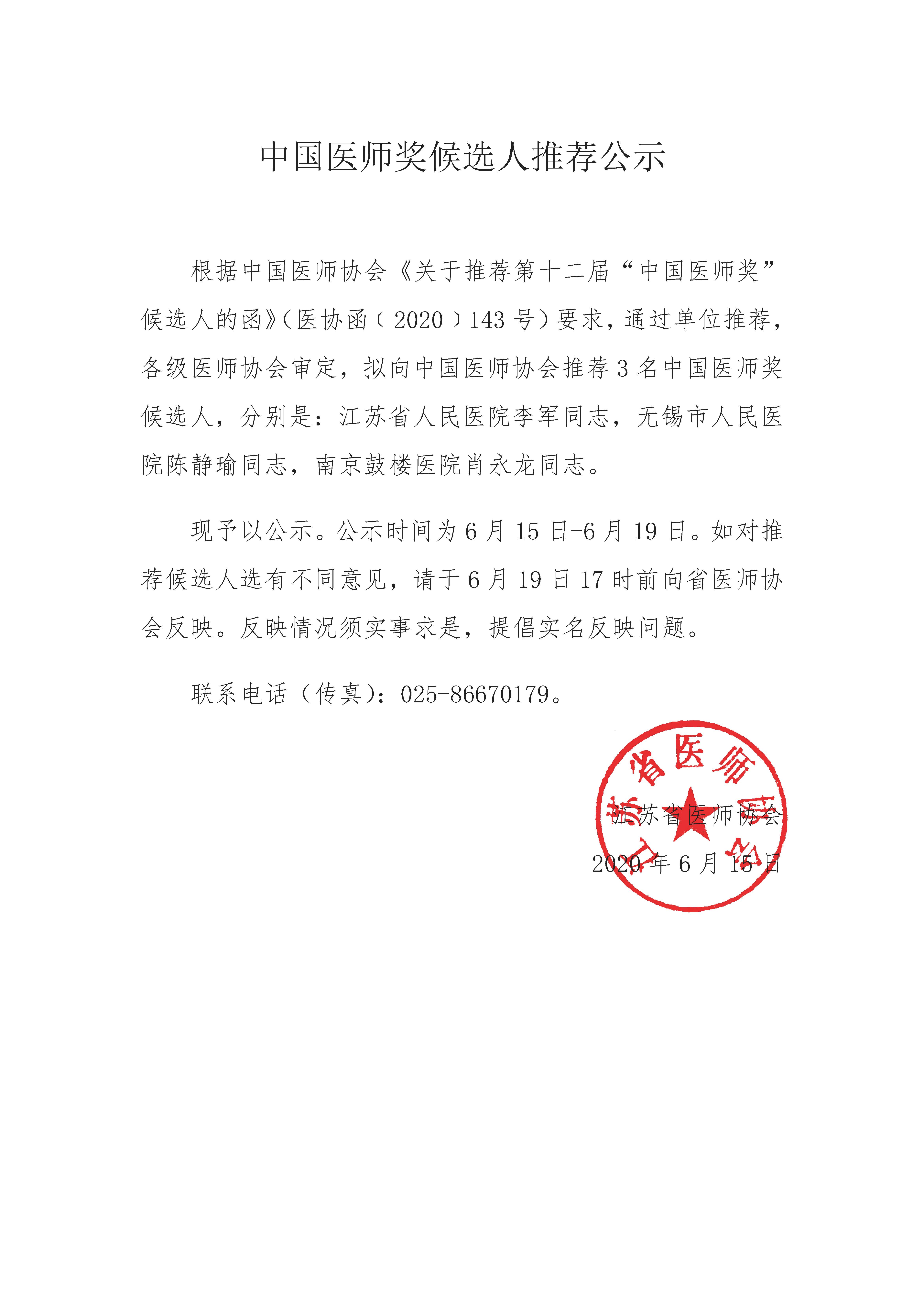 中国医师奖候选人推荐公示