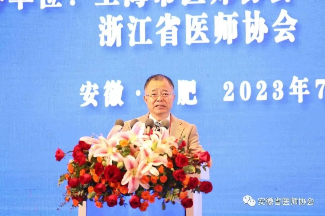 长三角医师联盟轮值主席、安徽省医师协会会长梁朝朝教授致辞。梁朝朝表示作为东道主,安徽省医师协会真诚地欢迎来自上海市、江苏省、浙江省医师协会的会长、秘书长们及各位医学同道。梁朝朝表示在加速推进长三角一体化高质量发展的关键时期,沪苏浙皖共筑“健康长三角”,着力推进医疗卫生服务一体化。这是长三角区域一体化建设的重要内容,也是深化医药卫生体制改革、完善医疗卫生保健体系、推进健康中国建设的战略举措。梁朝朝回顾了三年多来安徽抗击疫情中医务工作者所做的努力以及安徽省医师协会发展情况,并用“好山好水好人”概括了安徽的地理历史特点。他对联盟提出三点希望:一是以联盟成员单位二级机构为着力点,建立覆盖各学科的专科联盟;二是以联盟成员单位的名医资源带动医疗资源互通互联;三是充分利用联盟成员单位的学术影响力,定期举办高水平的高峰论坛、学术交流和专题培训,形成长三角的优质品牌。