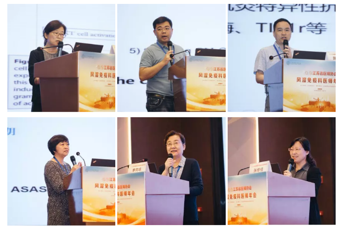 短暂茶歇后,会议继续进行,由钱先教授、丁翔教授、吴敏教授、吉恒东教授主持。来自安徽医科大学第一附属医院的徐建华教授向大家介绍了低分子肝素防治自发性流程的中国指南。南京医科大学免疫学系主任陈云教授作了《单核巨噬细胞介导的免疫重塑》专题报告。江苏省人民医院顾镭教授介绍了《原发性干燥综合征患者CD4CTL变化及其意义》。扬州大学附属医院李国青教授介绍了《滑膜成纤维细胞调控RA骨侵蚀的作用机制研究进展》。南京鼓楼医院风湿免疫科陈智勇教授介绍了《皮肌炎患者TFH细胞亚群变化的初步研究》。相关卫星会上,北京大学人民医院苏茵教授向大家讲解了《脊柱关节炎治疗进展》。中国科学技术大学附属第一医院李向培教授介绍了《低分子肝素防治自发性流产的中国指南》相关内容。江苏省人民医院风湿免疫科主任张缪佳教授带来了《抗磷脂抗体与产科APS》精彩演讲。
