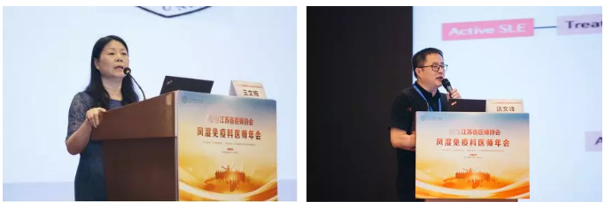 片刻休息后会议继续。主持为臧银善教授、王雪琴教授及马龙新教授。天津医科大学总医院风湿免疫科孙文闻教授介绍了肺间质病变肺高压这一疾病。江苏省人民医院王嫱教授向参会者介绍了免疫性心脏损伤的研究进展。南京大学医学院口腔医学院副院长王文梅教授讲解了与免疫相关的口腔粘膜病的辨析及治疗。卫星会上,江苏省人民医院风湿免疫科谈文峰教授介绍了《LN治疗进展及现状》。