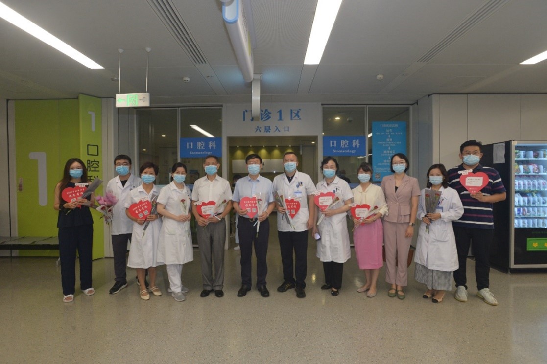 刘秘书长一行首先来到江苏省人民医院举行了“医路有你,温暖同行”主题献花活动。省人民医院副院长朱根以及院中层干部参加了献花活动。