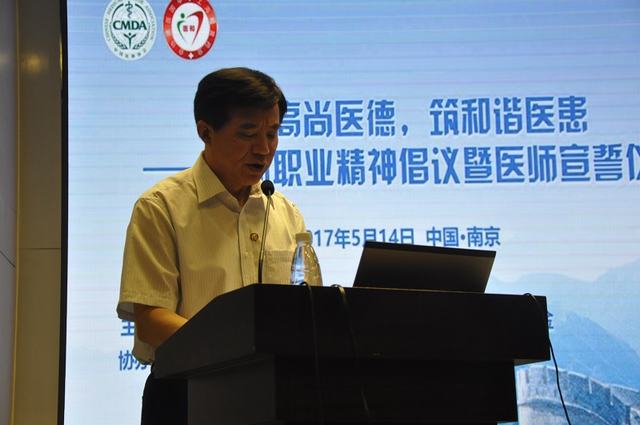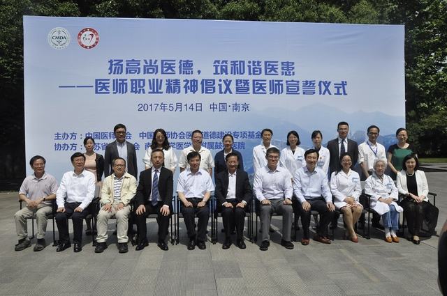 5月14日,中国医师协会“扬高尚医德,筑和谐医患”医师职业精神倡议暨医师宣誓仪式首站在南京鼓楼医院举行。中国医师协会张雁灵会长、国家卫生计生委医政医管局行风处陈虎处长、江苏省医师协会郭兴华会长等领导出席仪式并讲话。