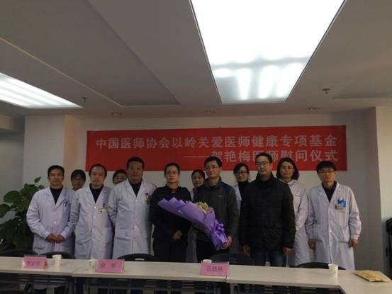12月6日下午,受中国医师协会及江苏省医师协会委托,江苏省医师协会维权自律部副主任范晓燕对身患疾病的南京市鼓楼区凤凰社区卫生服务中心贺艳梅医生进行慰问,范主任详细询问了贺医生目前的病情,转达了中国医师协会以岭关爱医师健康基金项目组及江苏省医师协会对她的问候和关心,希望贺医生能够早日战胜病魔,恢复健康,并送去了“中国医师协会以岭关爱医师健康专项基金”2万元。凤凰社区卫生服务中心李宏宇主任等领导及贺艳梅医生的爱人参加了慰问仪式。