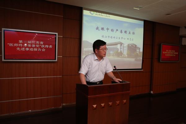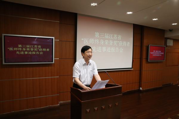 表彰会上,江苏省医师协会会长、江苏省医学会常务副会长黄祖瑚教授宣读了省医师协会和省医学会的联合表彰决定并讲话。他首先对荣获第三届江苏省“医师终身荣誉奖”的87位医师表示热烈祝贺。他说,江苏省医师协会自2010年成立后不久就设立了江苏省“医师终身荣誉奖”,每两年进行评选表彰。举办这项活动,首先是为了江苏医疗卫生事业薪火相传,蒸蒸日上。临床医学作为实践性很强的科学,老一辈对年青一代的言传身教、耳提面命至关重要。除了传承临床技能外,医学前辈们的品德和精神更加值得发扬光大。总结包括历届“医师终身荣誉奖”获奖者在内的老一辈医师们的优秀品德,至少可以用“爱、勤、严、敬、诲、廉”六个字来概括。“爱”,就是爱患如亲,正所谓“才不近仙,心不近佛者,……断不可作医以误世”,必须有仁爱之心才能做医师。“勤”,就是勤奋刻苦,成为好医师的过程就是一个虚心学习、刻苦磨炼、不断提升的过程。所谓天才,都是百分之一的灵感加百分之九十九的汗水。“严”,就是严谨细致,没有严谨作风也当不好医师,协和名家张孝骞把“戒、慎、恐、惧”和“如临深渊、如履薄冰”作为自己的座右铭。 “敬”,就是敬业奉献,老一辈专家有强烈的事业心、责任感,几十年如一日兢兢业业,不图回报。“诲”,就是诲人不倦,优秀医师都能甘当人梯,提携后辈,不仅自己成功,还要培养能超过自己的接班人。“廉”,就是廉洁行医,古代已有“杏林高手”、“誉满杏林”等廉洁行医的典故,21世纪的今天,廉洁行医的要求未变,千万不能以医谋私。黄祖瑚会长在讲话中还指出,开展这项活动,也是为了履行医师协会的职责。医师协会的宗旨是“服务、协调、自律、维权、监督、管理”,举办表彰医师的活动体现了其中“服务、协调”的内涵——对内服务于队伍建设,以老一辈优良作风的传承加强队伍建设;对外服务于医药卫生体制改革,协调各种社会关系。他指出,医改是一个系统性工程。医师协会作为医师的行业组织,应在动员广大医师积极参与医改并发挥主力军作用方面发挥应有作用。要切实加强对医师队伍的正面宣传,彰显“医师终身荣誉奖”获得者这样的代表了全国、全省医师队伍主流形象的先进人物的优良品质,努力营造平安有序的医疗执业环境和尊医重医的良好社会氛围。最后,他要求,各单位回去后要认真组织学习、宣传受表彰者的优秀事迹,让青年医师自觉传承老一辈“爱、勤、严、敬、诲、廉” 的优秀品德,努力为人民健康再作新贡献。