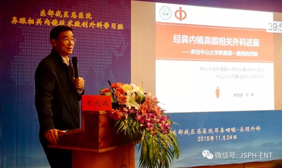“鼻眼相关内镜技术微创外科学习班”由东部战区总医院承办,特邀中山大学附属第一医院耳鼻咽喉科医院鼻科主任史剑波教授作专题讲座,介绍了内镜鼻眼相关外科手术的进展,特别分享了来自中山大学附属第一医院的经验,学员们认真听讲并启发思考。随后,省内12位专家学者就本次学习班的主题进行讲座,内容包括鼻眼相关手术中应关注的眼科问题、困难的泪囊鼻腔吻合术、上颌骨囊肿手术治疗的术式探讨、鼻咽纤维血管瘤的鼻内镜手术治疗、变应性鼻窦霉菌病的再认识、鼻内镜手术眶并发症解析、鼻内镜下蝶窦开放的术式选择、鼻中隔手术的现状与变革、额窦炎眶内并发症、鼻内镜下自体材料脑脊液鼻漏修补术、额窦手术新分类(Wormald分类)等。