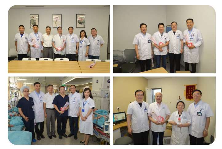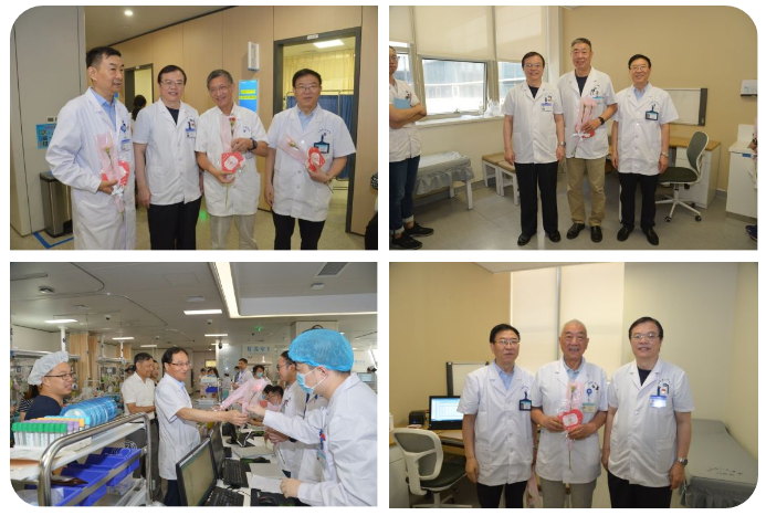 第二组由江苏省医师协会副秘书长全钰平和江苏省人民医院院长赵俊到病房一线进行慰问。第一站就来到了急诊医学中心,他们在区诊间和重症抢救室给每一位医生送去了鲜花和贺卡,并叮嘱当班医生注意身体,劳逸结合。随后又去肝胆中心病区慰问了王学浩院士团队,感谢院士作为医师模范代表所做出的贡献。之后走访慰问了胸外科、心脏大血管外科,心血管内科、神经外科、皮肤科、肿瘤科、老年呼吸科、老年ICU等科室,并为辛勤的医务人员送上鲜花和贺卡。