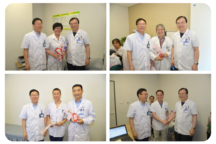第一组由江苏省医师协会副会长兼秘书长刘彦群和江苏省人民医院党委书记唐金海走访了门诊各诊区,对奋战在诊疗一线的出诊医师进行慰问,先后来到康复医学科主任励建安院士、胰腺中心主任苗毅教授、普外科主任徐泽宽教授以及各科专家门诊、普通门诊以及健康管理中心,还看望了仍然坚守在医疗一线的老专家们,为他们送上鲜花和精美的贺卡,感谢他们的无私奉献和辛苦付出,并叮嘱他们时刻牢记医务工作者的神圣使命,不忘初心,为人民的卫生健康事业努力奋斗。