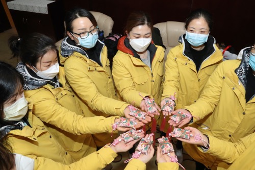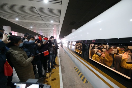 2020年2月21日9:27,江苏省第九批援武汉医疗队(第五批国家中医医疗队(江苏))在南京南站登上高铁,奔赴湖北省武汉市,与先前抵达的第三批国家中医医疗队(江苏)会合,增援江夏方舱医院(B区),开展新冠肺炎患者中医医疗救治工作。江苏省卫生健康委党组书记、主任谭颖同志、江苏省卫生健康委副主任、省中医药管理局局长朱岷同志前往南京南站为“勇士们”加油壮行。