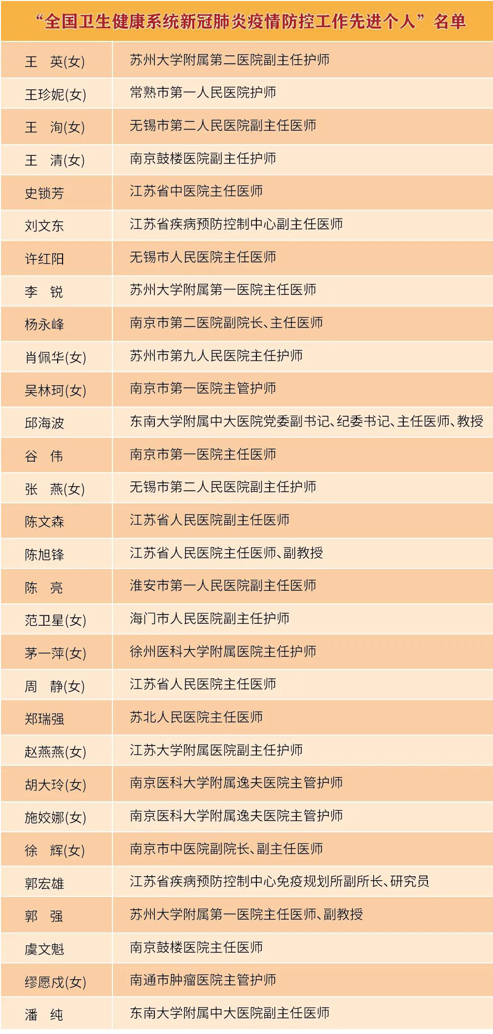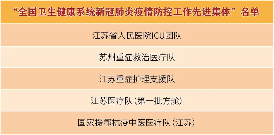 近日,国家卫生健康委、人力资源社会保障部、国家中医药管理局印发《关于表彰全国卫生健康系统新冠肺炎疫情防控工作先进集体和先进个人的决定》,江苏5个集体荣膺“全国卫生健康系统新冠肺炎疫情防控工作先进集体”称号,30位医务工作者荣膺“全国卫生健康系统新冠肺炎疫情防控工作先进个人”称号,徐辉同志被追授“全国卫生健康系统新冠肺炎疫情防控工作先进个人”称号,获奖个人享受省部级表彰奖励获得者待遇。