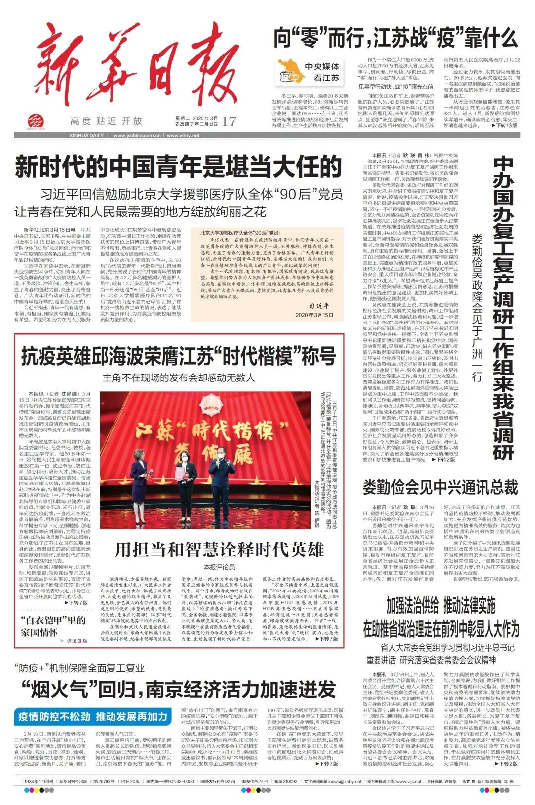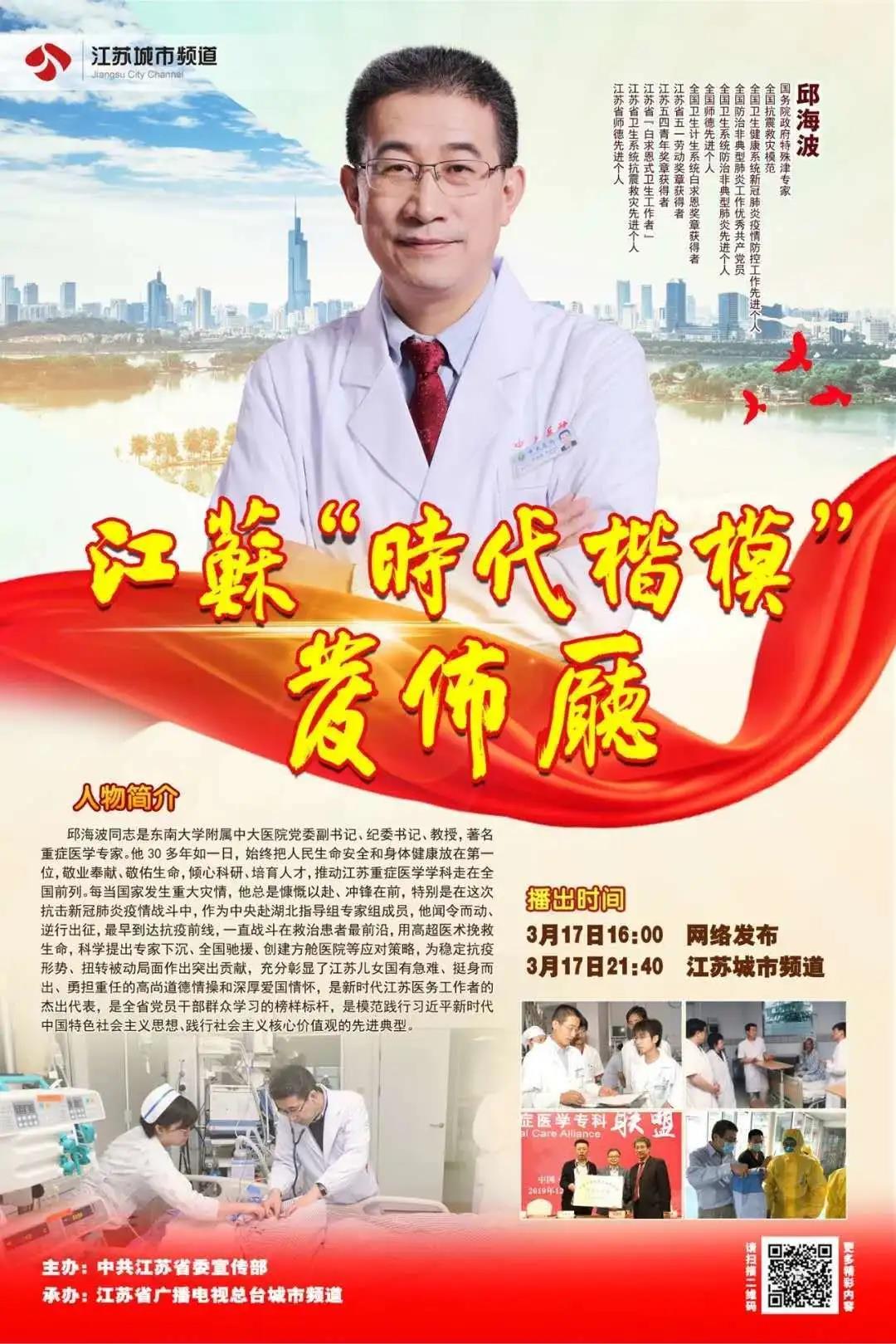 3月15日,中共江苏省委宣传部在南京举行发布会,授予邱海波江苏“时代楷模”荣誉称号。副省长陈星莺出席发布会。邱海波目前仍奋战在湖北抗击新冠肺炎疫情救治前线,主角不在现场的特殊发布会却感动和激励无数人。