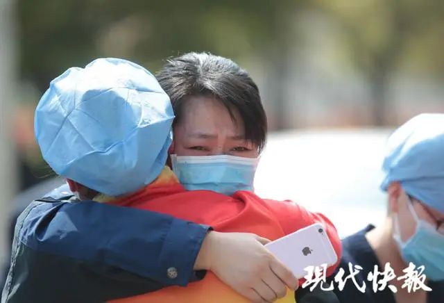 武汉江夏区第一人民医院呼吸三病区护士长吴爱喜抱着江苏省海安市人民医院感染科护士长周蓉,泪流满面,“谢谢你们,谢谢你们在我们最困难的时候来帮助我们。”吴爱喜说,一大早听说江苏医疗队的医护要走,她脱了护理服就来到酒店。