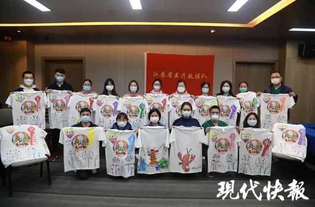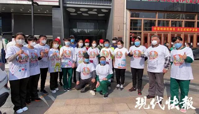 江苏援武汉医疗队队员,徐州市中心医院重症三区护士长王志栋留意到相关信息后,主动联系“同袍计划”活动发起人徐敬阳,申请了50件空白版“与子同袍”文化衫,邀请队友一起在文化衫上涂鸦并转赠给所支援的江夏区第一人民医院的战友们。