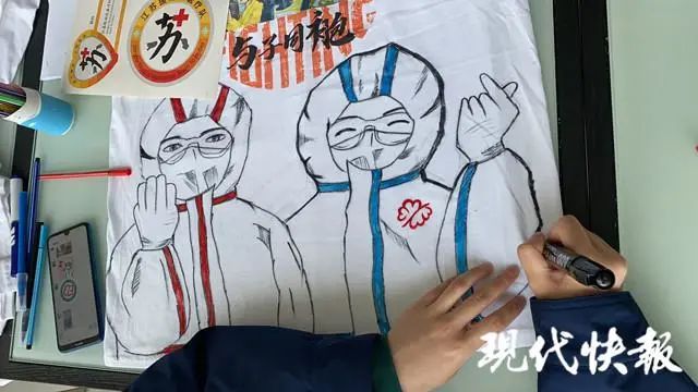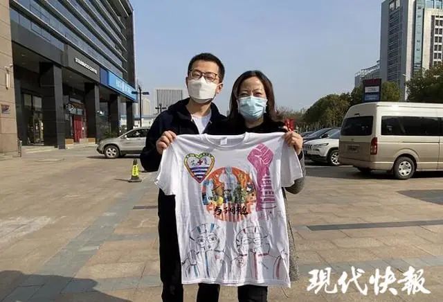 这件文化衫程浩然绘制了一个多小时,“‘与子同袍’就是说我们是一家人,今天我们要回去了,想让妈妈来收一下衣服,也希望妈妈要保护好自己,虽然现在是阶段性的胜利了。”听到程浩然这么说,倪宝红眼眶湿润了,“谢谢儿子大老远来武汉支援我们,你们真的很辛苦,也来了很多天了,我们很感动。”