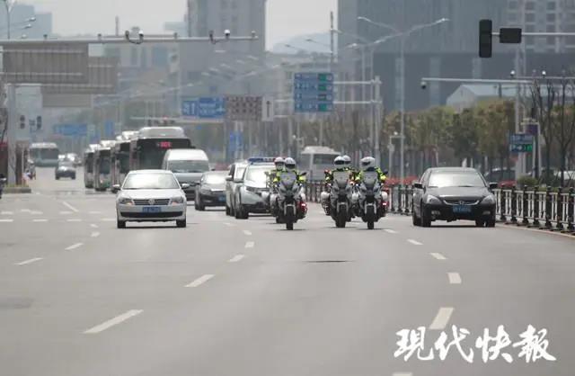 17日中午12点,9辆大巴车载着首批返程的江苏医务人员驶向机场。