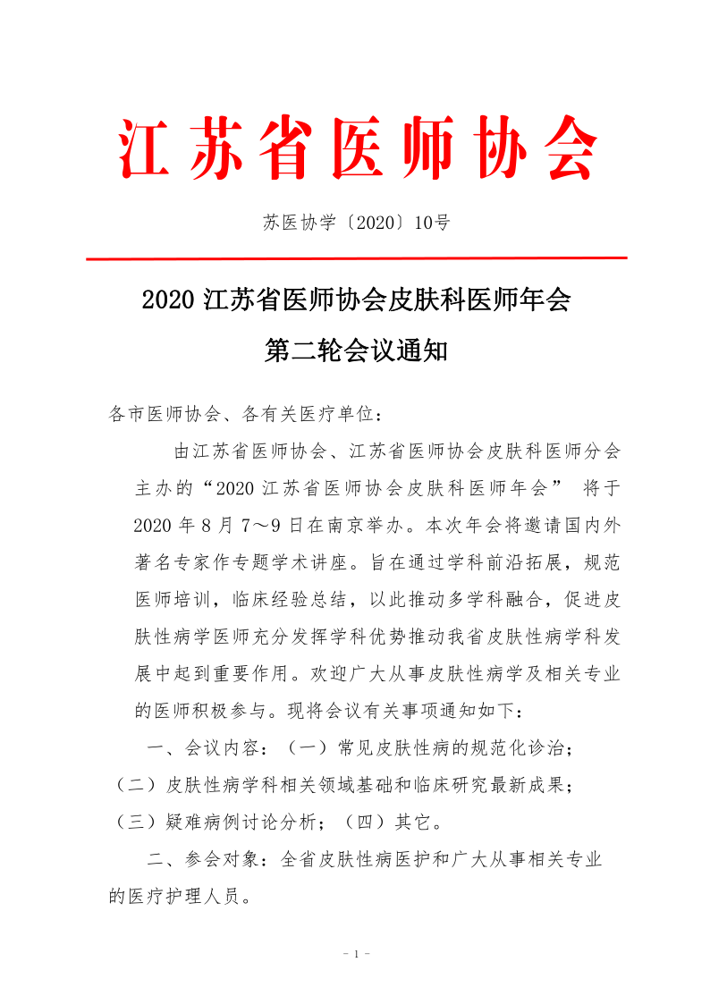 苏医协学〔2020〕10号-2020江苏省医师协会皮肤科医师年会第二轮会议通知