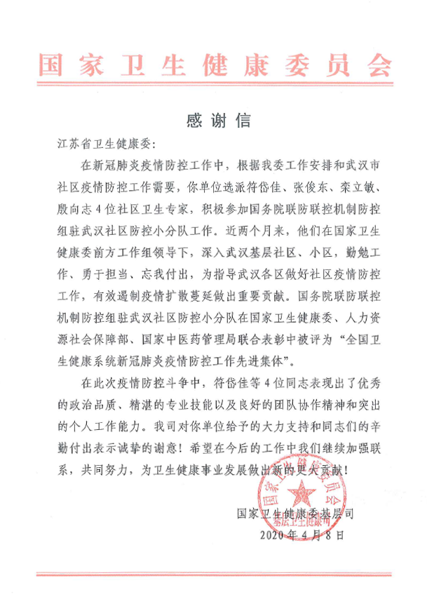 阶段性的成果来之不易。在抵达武汉之初,队员们发现这里的社区隔离措施尚不完善,极易引起病毒的扩散和传播。“我们建议,尽快对社区进行封闭,大型超市也不能开放了。” 江苏援武汉基层卫生队队长符岱佳和队员们很快向防控指挥部提出建议,通过隔离的方法阻断传染源,“首先要切断传播途径,另外对于已经感染的病人也要尽快地应收尽收,避免在社区内的交叉感染。”