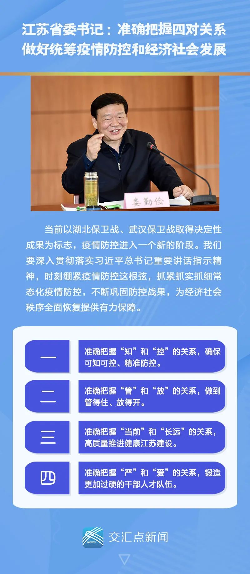 娄勤俭指出,当前以湖北保卫战、武汉保卫战取得决定性成果为标志,疫情防控进入一个新的阶段。我们要深入贯彻落实习近平总书记重要讲话指示精神,时刻绷紧疫情防控这根弦,抓紧抓实抓细常态化疫情防控,不断巩固防控战果,为经济社会秩序全面恢复提供有力保障。