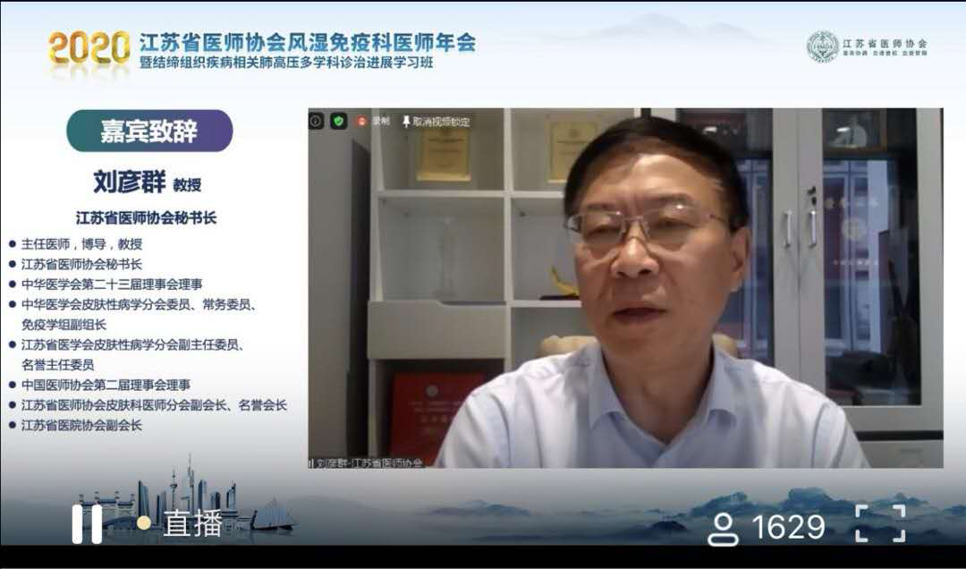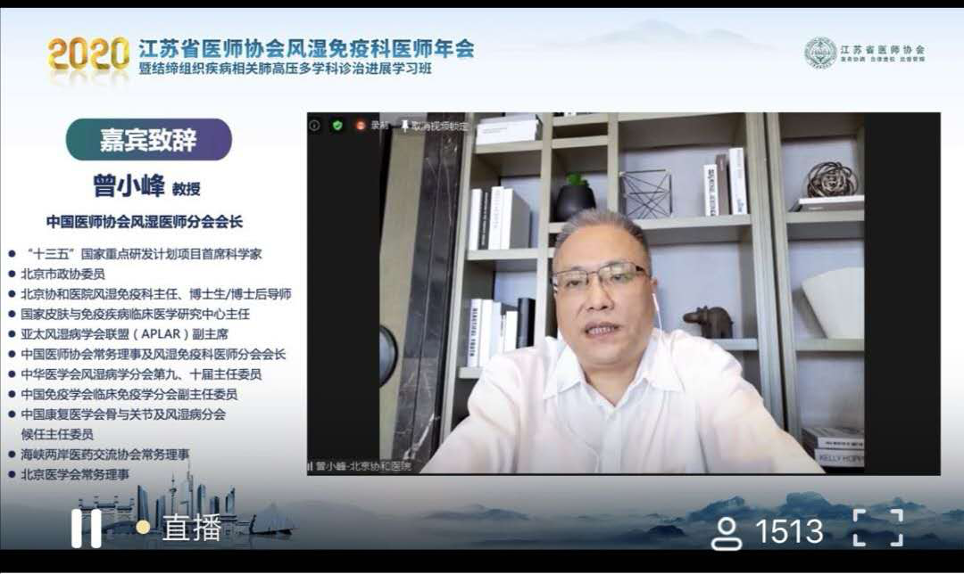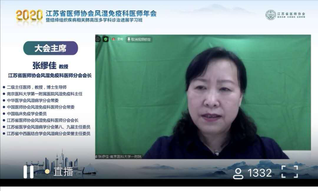 2020年9月11日~13日,由江苏省医师协会、江苏省医师协会风湿免疫科医师分会主办,江苏省人民医院风湿免疫科承办的2020江苏省医师协会风湿免疫科医师年会暨结缔组织病相关肺动脉高压多学科诊疗进展学习班圆满召开。为积极响应、支持控制新冠肺炎疫情,本次会议以线上形式展开,会议开始就吸引了1332人观看直播,最高峰时观众达2028人,大家积极线上提问、交流与讨论,气氛热烈。