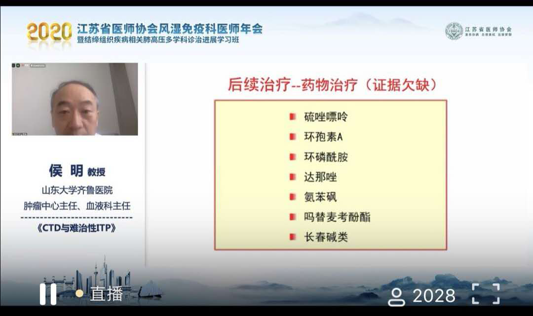 开幕式后随即开启上半场会议进程,由吕力为教授、李建勇教授、赵岩教授主持。苏州大学附属第一医院血液科副主任韩悦教授带来《CTD与微血管病》主题演讲,介绍了TTP诊疗进展。山东大学齐鲁医院肿瘤中心主任、血液科主任侯明教授带来了《CTD与难治性ITP》主题演讲,向我们解读了2019版ITP国际共识报告更新。江苏省人民医院血液科副主任徐卫教授带来《CTD与淋巴瘤》演讲,从临床特点、机制、治疗与预后几个方面讨论了自身免疫性疾病并发淋巴瘤。接着江苏省人民医院风湿免疫科孙晓萱医师通过分享2例CTD相关淋巴瘤病例,生动讲解并总结了自身免疫性结缔组织病合并淋巴瘤的诊疗经验。紧接着钱先主任、袁风红主任、俞海国主任、闵凤玲主任、李春香主任、潘文友主任共同讨论,分享了他们宝贵的CTD合并血液系统损害的诊疗经验。