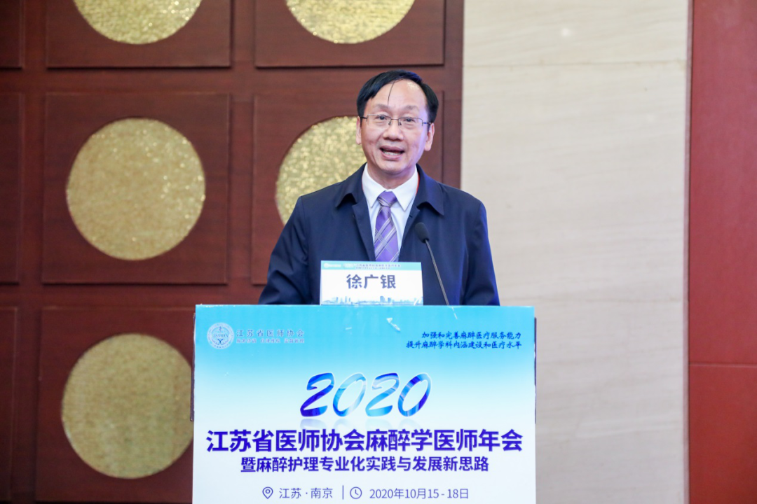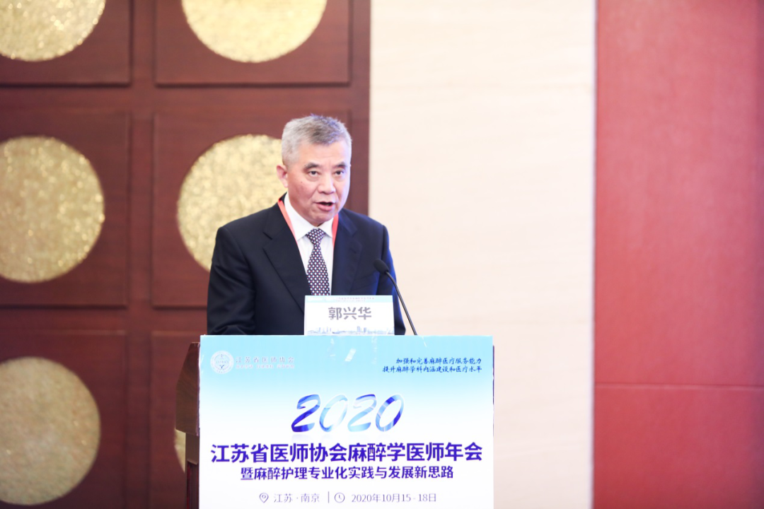 江苏省医师协会会长郭兴华致开幕辞,他对会议的召开表示祝贺,对包括麻醉科医生在内的广大医务工作者表示崇高的敬意和深深的感谢。郭会长对麻醉学医师分会取得的工作成绩表示肯定,指出麻醉学科在临床麻醉和危重症抢救中积累了丰富经验,近期国务院办公厅印发意见明确要全面优化医学人才培养结构,推进麻醉等紧缺专业学科建设和人才培养,为麻醉学科的发展注入新的动力。郭会长希望麻醉医师全体同仁在今后的工作中增强风险意识,抓好秋冬季疫情防控措施,同心协力,为推进我省麻醉医学发展共同努力。