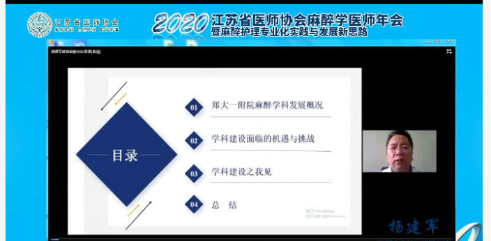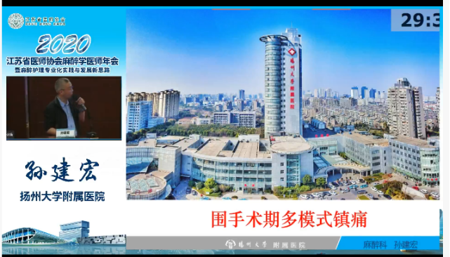 2020年10月15~18日,江苏省医师协会麻醉学医师年会在南京顺利举行。本次会议由江苏省医师协会主办,江苏省医师协会麻醉学医师分会承办。江苏省医师协会会长郭兴华、江苏省卫生健康委员会副主任兰青、中国医师协会麻醉学医师分会会长于布为、江苏省医师协会麻醉学医师分会名誉会长杨建平、江苏省医师协会麻醉学医师分会会长马正良致开幕辞。开幕式由顾小萍教授主持。