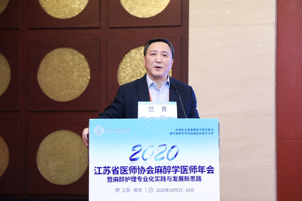 江苏省卫生健康委员会副主任兰青致辞肯定了麻醉医生在抗疫中的积极作用,麻醉学科已成为医院重要的平台科室,但麻醉医生队伍建设仍需加强,党中央高度重视麻醉学科的发展。省医师协会在这方面已经做了很多工作,希望今后的工作中不光致力于提高麻醉医师的业务能力,也要关心麻醉医师的工作环境和待遇等方面。