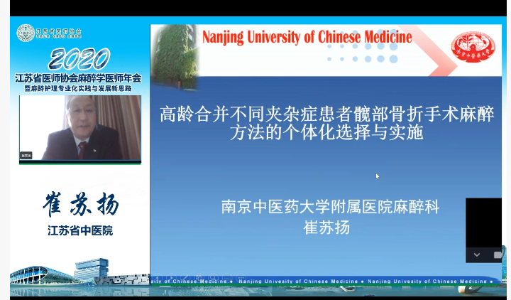 江苏省中医院崔苏扬教授分享了《高龄合并不同夹杂症患者髋部骨折手术麻醉方法的个体化选择与实施》。结合实例分享了不同麻醉方法对患者术后并发症和预后的影响。